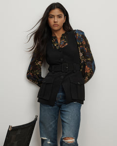 A sleek vest with a utilitarian edge. Expertly tailored from a premium stretch blend, the Becker features a slim, waist-defining fit with a wide belt and double cargo pockets. A cutaway hem and U-neckline add a modern, feminine touch. Style it with black wide-leg trousers and heels for a refined look, or dress it down with denim and ballet flats.