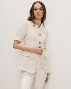 The classic lady jacket, reimagined. Impeccably tailored from Italian stretch-cotton tweed, the ecru Bodie jacket features short sleeves, a collarless crew neck, and an elongated silhouette that falls below the hip. Fitted with a nipped-in waist, it's finished with tortoiseshell buttons, flap pockets, and a cutaway hem. The style is polished enough for the office, yet easy to dress down—just add jeans and flats for an effortlessly pulled-together look.