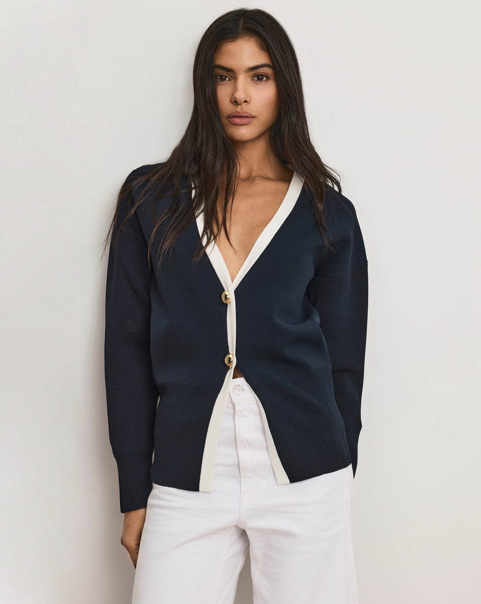 The perfect boyfriend cardigan. Spun from a sporty stretch knit, the navy Cillian sweater features a relaxed, oversized fit with dropped shoulders for a cool slouch and ease of movement. Two gold buttons at the center add polish while the contrasting white trim provides graphic edge. Pair with wide-leg jeans or wear as a layering essential—it's endlessly versatile.