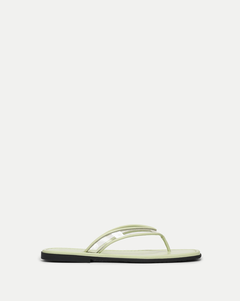 An elevated take on the classic flip-flop. This warm-weather essential is reimagined with a pastel green leather base and chic clear jelly straps, trimmed with matching green piping. Sleek and effortless, it’s your new warm-weather go-to—perfect for the beach, boardwalk, and weekend errands.