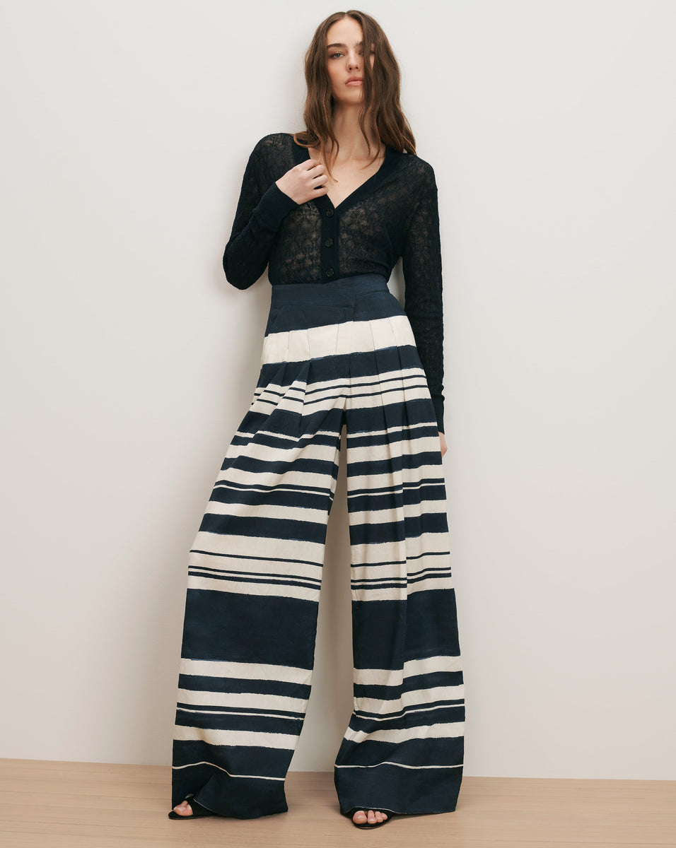 The statement spring trouser. Crafted from a crisp linen blend with bold navy-and-white stripes, the Heron pant is defined by a high-waisted, crossover waistband and extra-wide-leg silhouette. Dramatic double pleats and topstitched seam details add dimension, while a clean flat front keeps the look sleek and streamlined. Tuck in a classic button-down or pair with a simple tee—it’s an easy way to elevate everyday dressing.