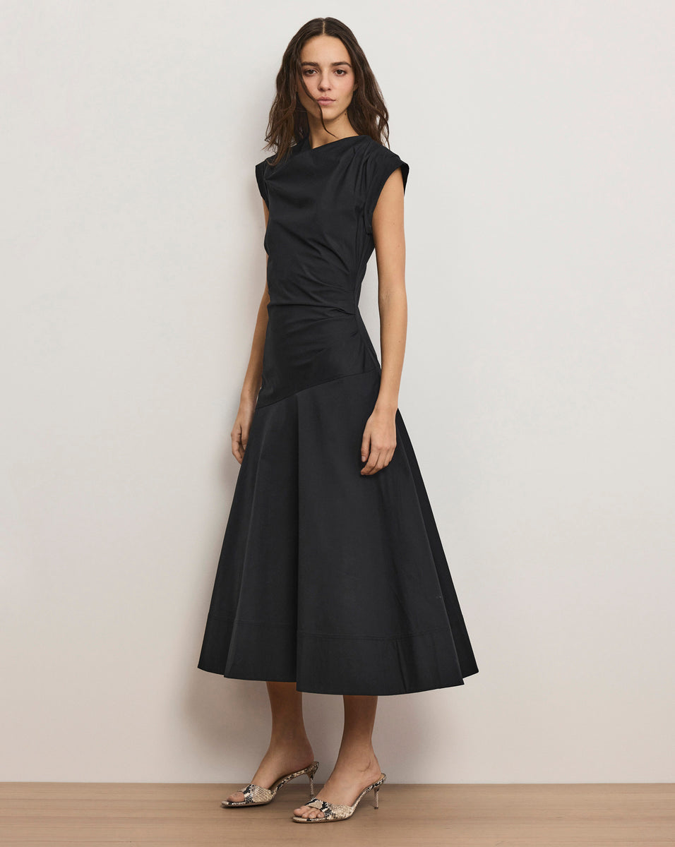 The ultimate spring dress for the minimalist. Crafted from stretch cotton poplin, the black Lisette midi dress balances ease with elegance. It's a modern take on the fit-and-flare silhouette, with cinching side ruching that falls into a softly draped circle skirt. Finished with cap sleeves and artful gathering at the shoulders, it's chic for both weekends and getaways—just add sandals or espadrilles.