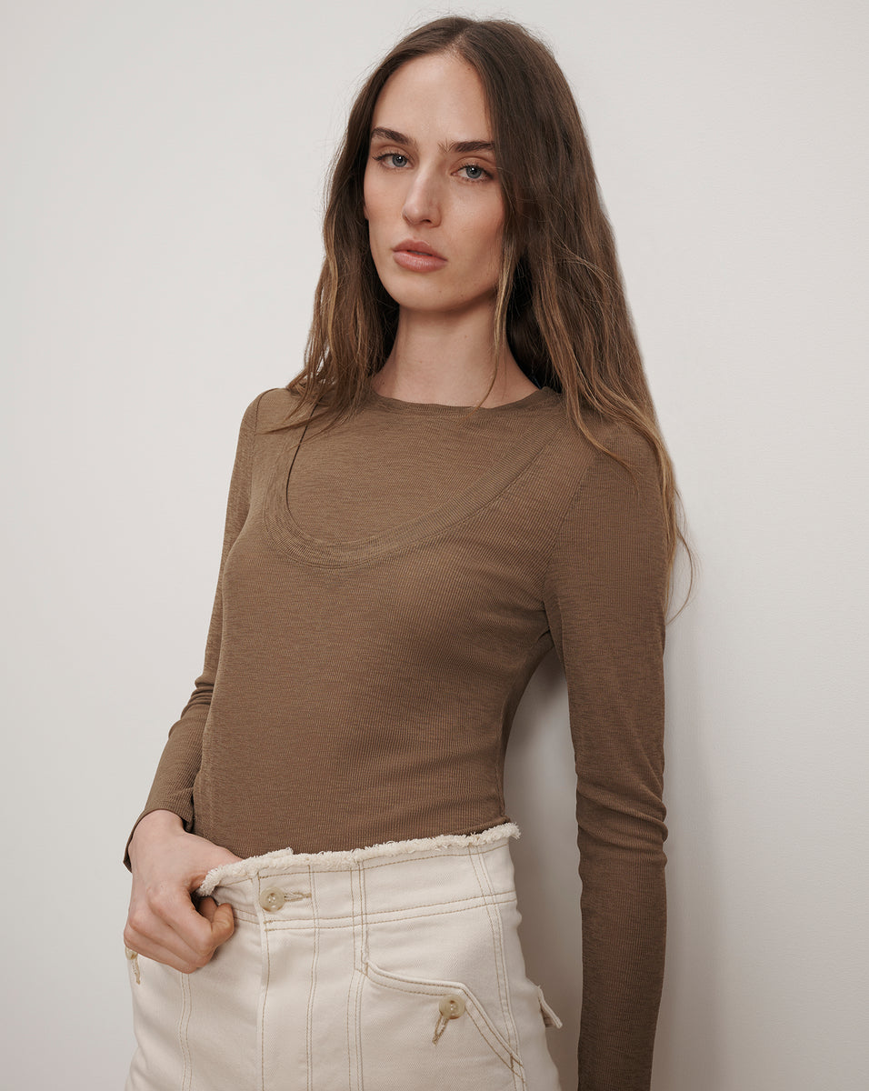 A foundational piece you’ll reach for again and again. The Neita is a long-sleeve crewneck crafted from a delicate, semi-sheer stretch rib knit that softly hugs the body for a slim, flattering fit. A double neck trim creates a trompe l’oeil effect, adding subtle dimension and a modern edge. This double layered top is a standout on its own, or as an elevated base for layering.