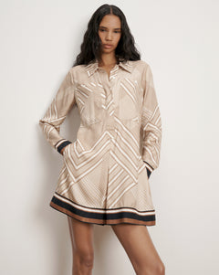 A versatile mini to wear now—and later. Crafted from a premium silk blend with a bold geometric pattern, Pryce is a relaxed, long-sleeve mini dress with a subtle A-line silhouette and front pleating. A collared hidden button placket, oversized front patch pockets, and striped hems complete the look. Pair with sandals for summer ease; layer over pants or tights once temperatures start to drop.