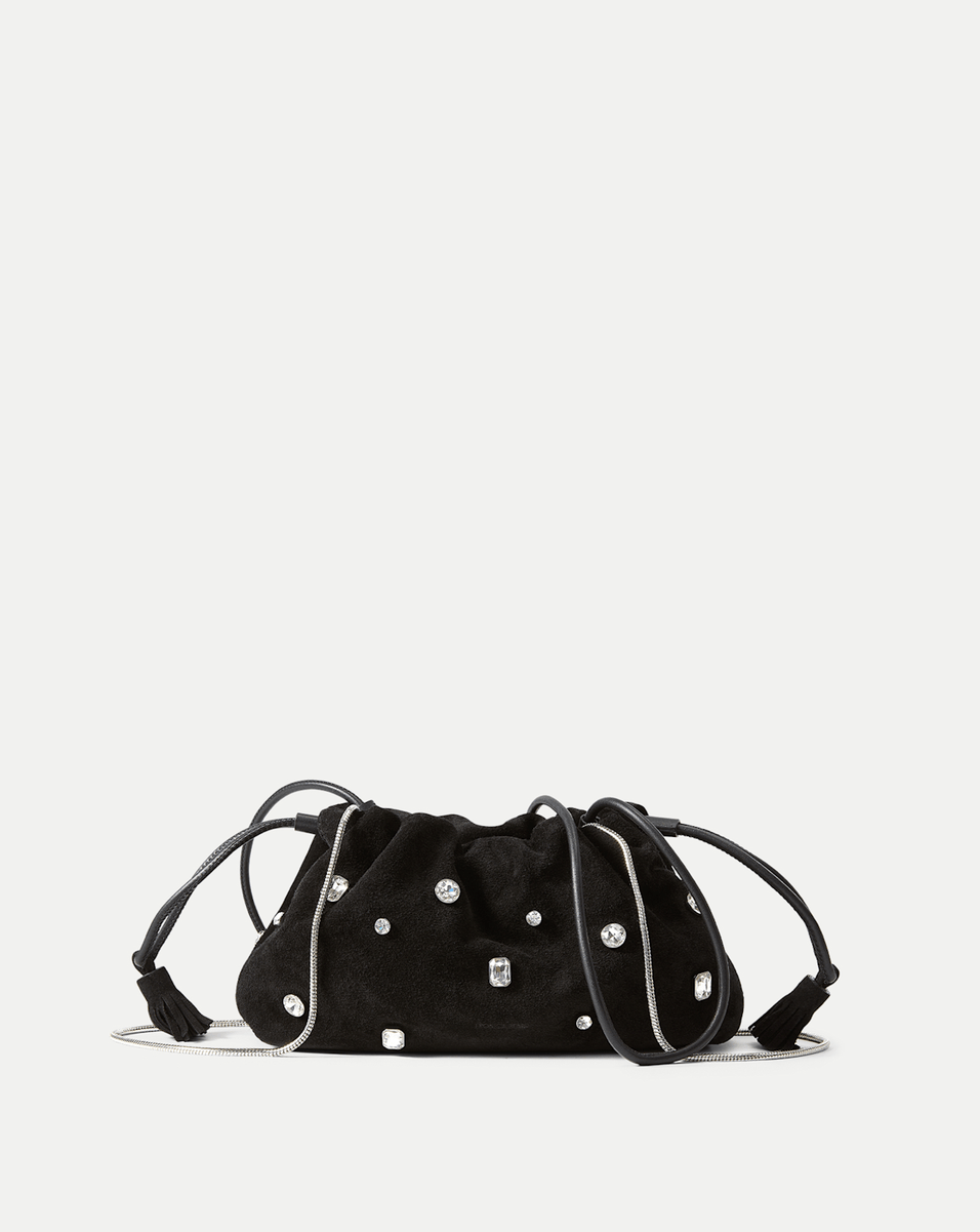 A petite, statement-making take on our classic Stash bag. Crafted from black Italian suede and embellished with assorted crystals, this pouch features a softly structured silhouette with a gathered, cinchable top, finished with leather tasseled drawstrings at both ends. Two straps—one in smooth leather, the other a silver snake chain—offer maximum versatility. Inside, a zip pocket and magnetic tab closure keep your essentials secure.