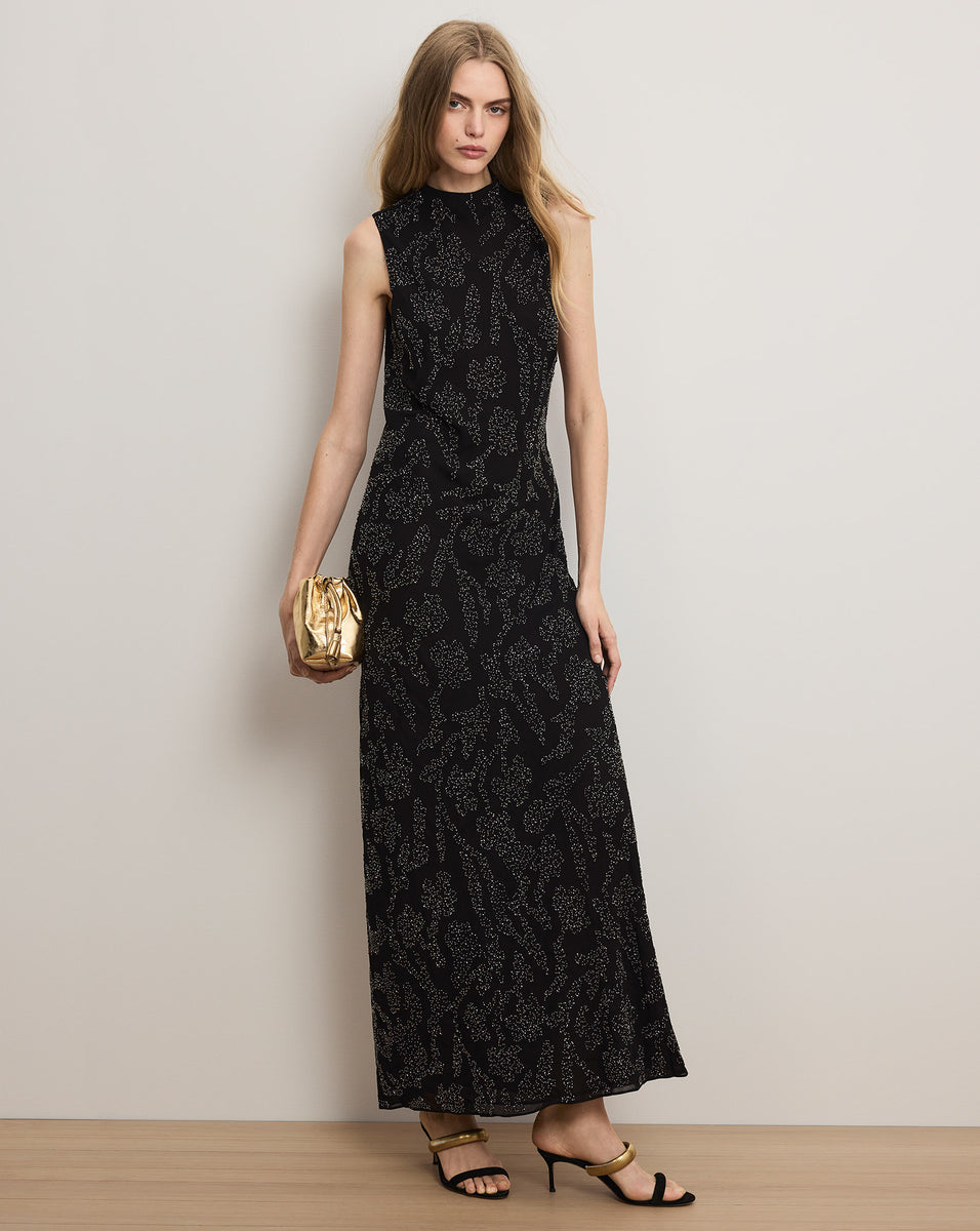 A maxi that makes a statement. Crafted from sheer, black georgette, the Sylven sleeveless dress is cut for a slim, body-skimming fit and features silver floral hand beading for a high-shine finish. An elegant mock neck, keyhole back closure, and detachable slip complete the look. A chic choice for your next big event—just add heels and go.
