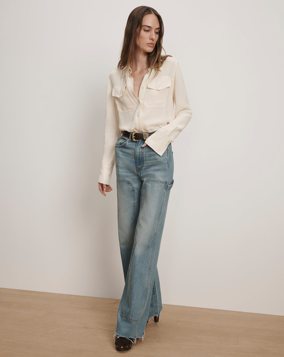 The Taylor you know in love, now with a Western twist. Made in LA from non-stretch Japanese denim, this classic high-rise, wide-leg silhouette features denim panels down each leg for a chaps effect, finished with a raw hem for effortless cool. Pair these western jeans with everything from a silk blouse to a plain white tee for a chic and easy look.