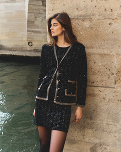 The ease of a cardigan, the polish of a jacket. Crafted from a black tweed knit, the Ceriani features a deep V-neckline, bezel-style buttons, flap pockets, and contrast metallic blanket stitching along the trim. Perfectly polished yet versatile, it pairs just as well with an LBD as it does with jeans.