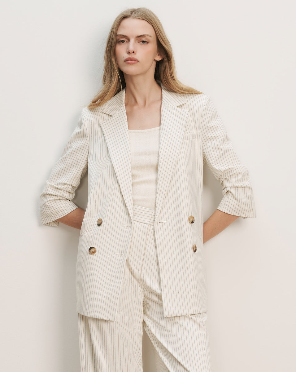 The classic pinstripe blazer—reimagined. Crafted from luxe midweight suiting in soft off-white, the Rupert dickey jacket combines sharp tailoring with a relaxed silhouette. Designed for an oversized fit, it features pre-ruched sleeves, a double-breasted closure, and a classic notch collar that feels both timeless and modern. Style it with trousers for a cool take on the suit, or pair with denim and ankle boots for signature VB polish.