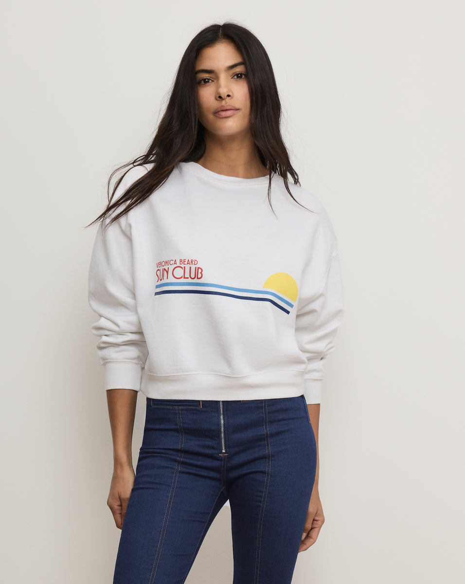 Welcome to the VB Sun Club. Crafted from a ring-spun cotton blend, this sweatshirt has an ultra-soft hand feel. Featuring an Après Sun motif with “Veronica Beard Sun Club” on the front, it flips to “Veronica Beard Ski Club” on the back. Designed for a cropped, relaxed fit, it’s finished with a classic crewneck and wide ribbed trim along the sleeves and hem. The perfect throw-on-and-go layer—ideal for wherever your adventures take you.