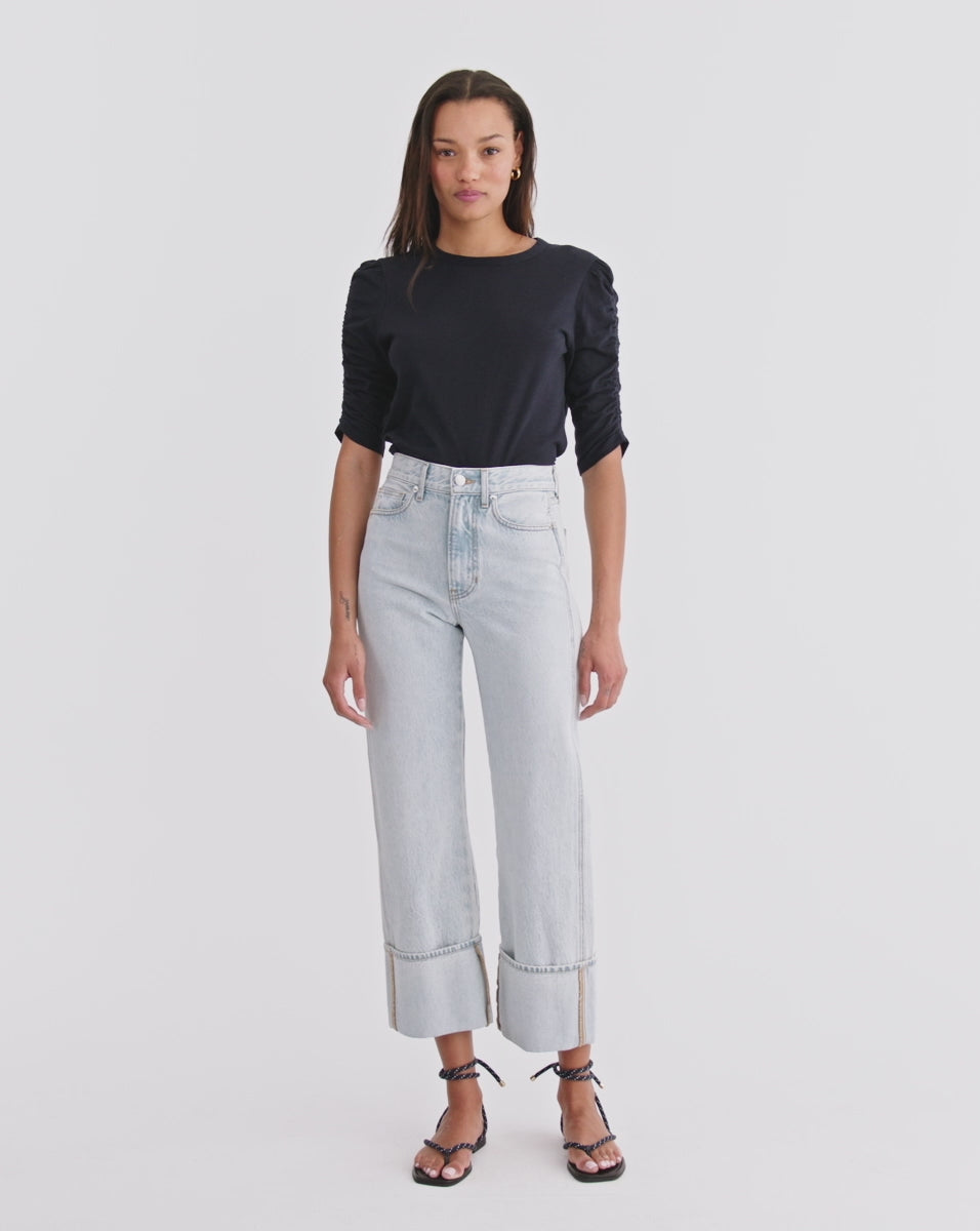 Statement jeans with trend-led details—introducing our updated Dylan, with oversized cuffs. Made in LA from non-stretch Italian denim, it features the high-rise, straight-leg silhouette you love and a versatile ankle length that works well with flats and heels alike. In a faded pale wash, this boyfriend style will be your new everyday go-to jean.