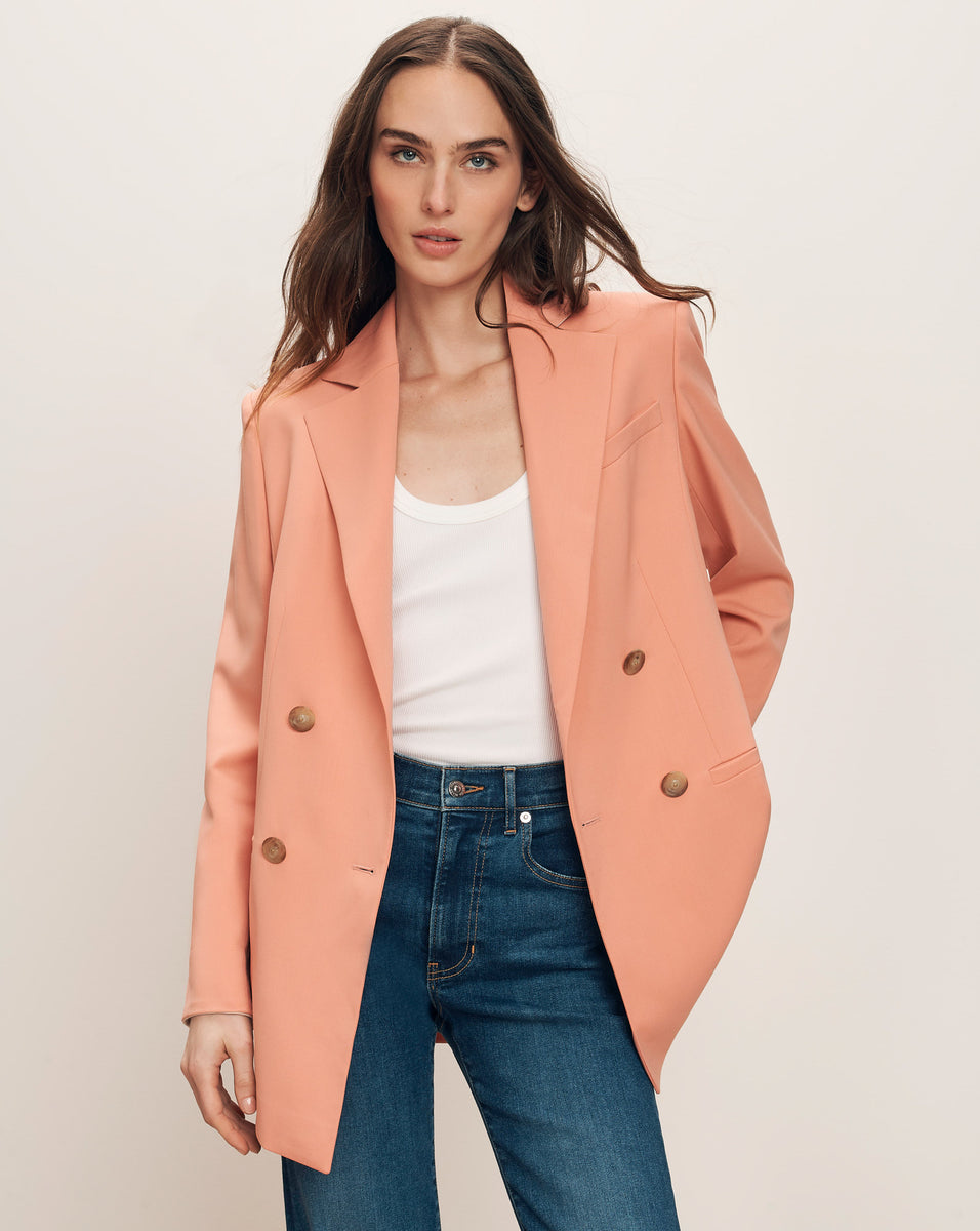 An effortless spring blazer, the Fairchild dickey jacket is crafted from lightweight gabardine with a hint of stretch. Cut for an oversized fit, it features a slouchy, double-breasted silhouette and welt pockets for a tailored finish. Perfect for carrying you from office to happy hour, style this soft coral jacket with trousers or denim.