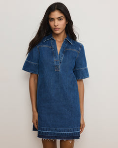 Crafted from premium denim, the Felice is a cool, structured take on the mini shirtdress. Designed with a collared split neckline and buttonless half placket, it features quarter sleeves and a raw-edged let-down hem for a textured finish. Effortless and versatile, it pairs with everything from sandals to slingback heels, boots, or sneakers.