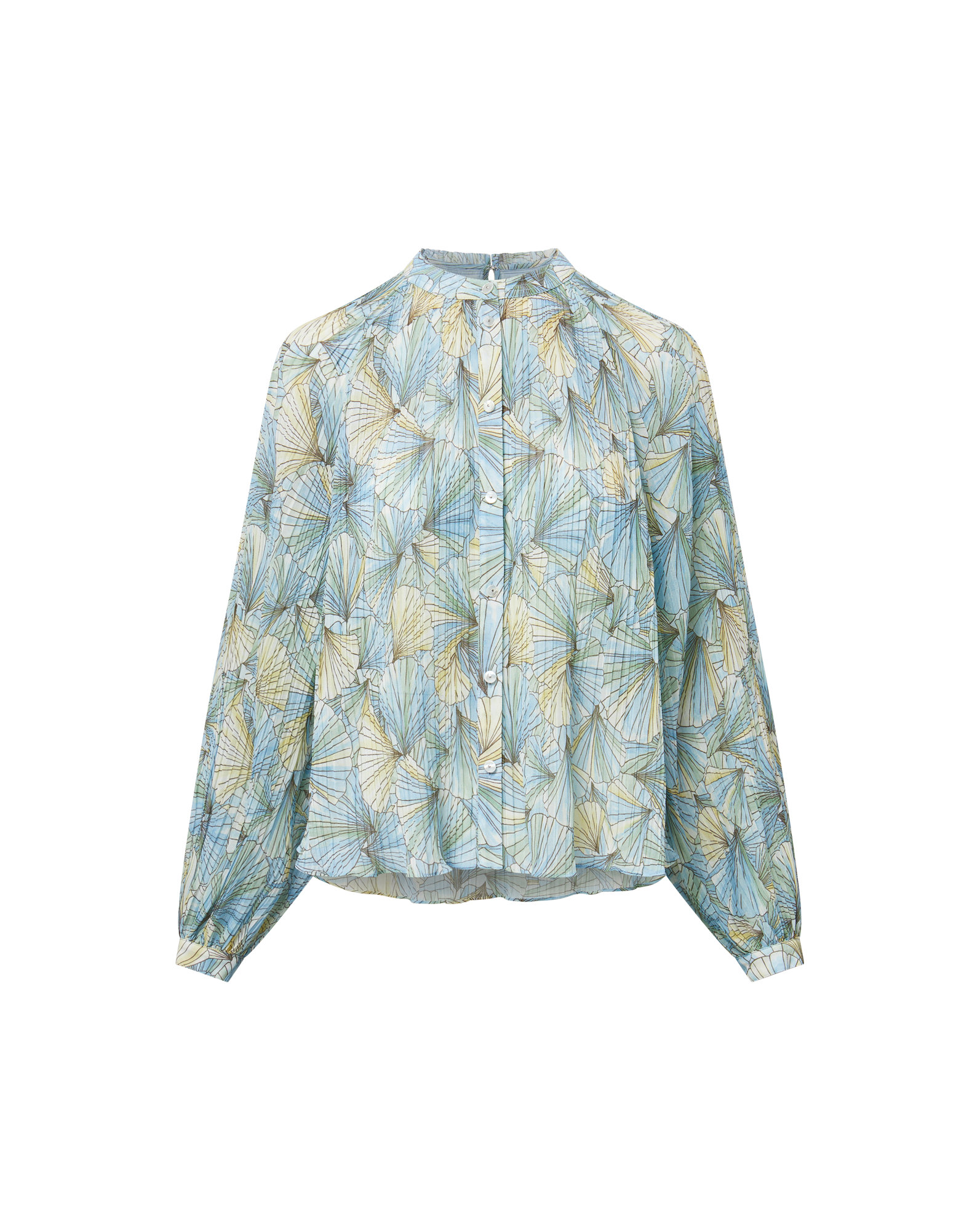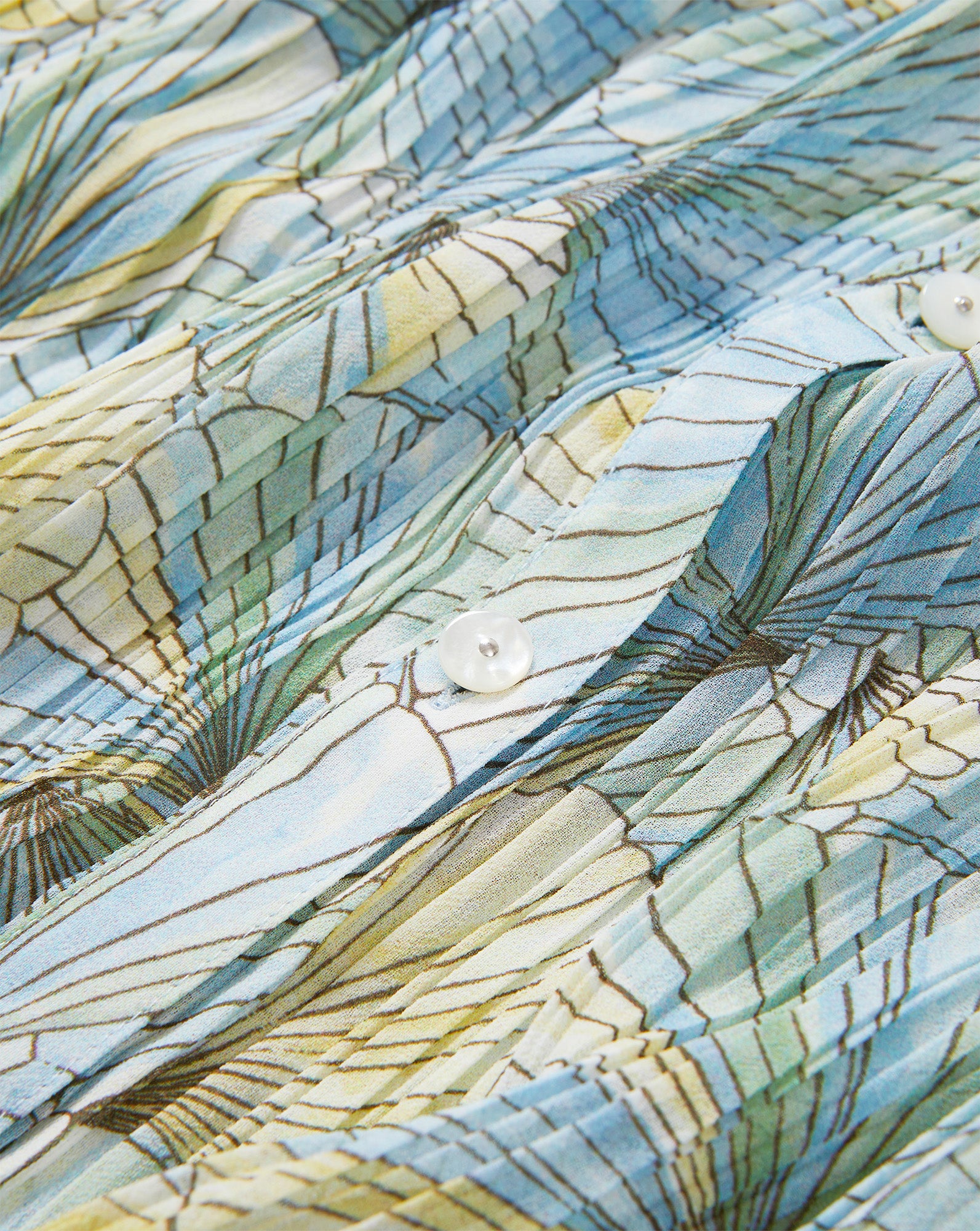The ultimate in feminine ease. Made from a premium stretch fabrication, the Fennel blouse is defined by allover pleating and a custom painted shell pattern in pale blue and yellow. Cut for a breezy, relaxed fit, the button-down shirt features a split-V neckline and gently voluminous bishop sleeves. Pair with jeans to elevate the everyday.