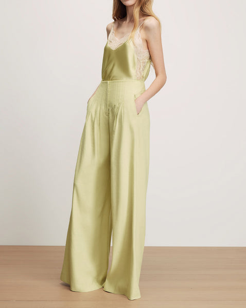 The essential warm-weather trouser. Crafted from Italian stretch-linen twill in pistachio green, the Hoyt pant is lightweight and breathable with beautiful drape. Its high-rise, wide-leg silhouette features elongated seam details at the waist, creating soft, natural pleats. Welt pockets and a hidden hook-and-bar closure lend a polished finish. Endlessly wearable, tuck in a simple tank for easy polish, or style with the coordinating Hartwell vest for a spring take on tailoring.