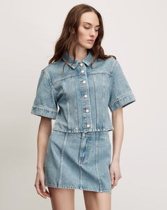 Crafted from premium non-stretch denim in a medium-blue wash, the Malcom jacket is cut with a boxy, cropped silhouette, featuring paneled construction and wide, elongated short sleeves for a modern feel. A crisp collar and button-front closure complete the look. A warm-weather take on a classic, it pairs effortlessly with the matching Marquita mini skirt or with tailored shorts for contrast.