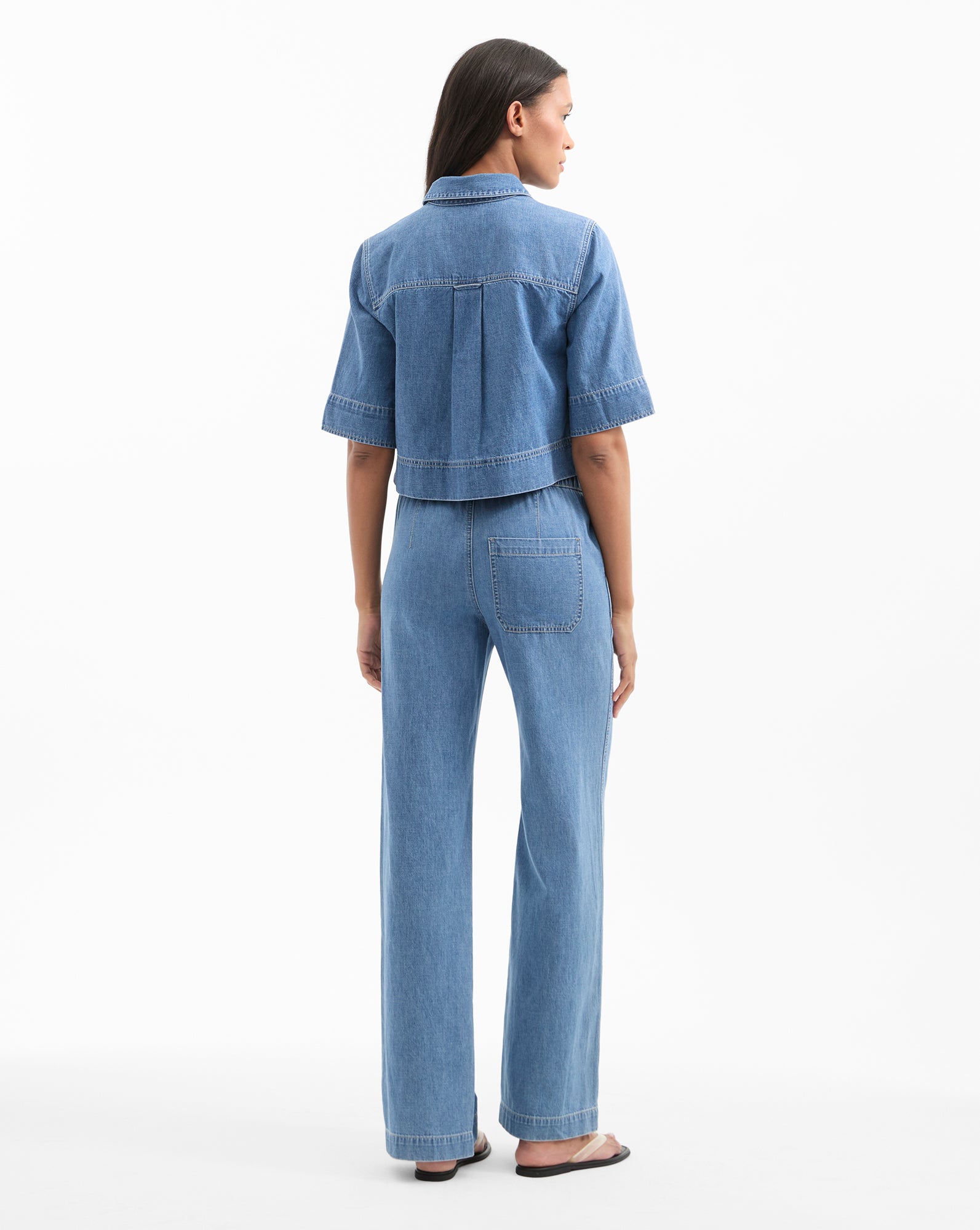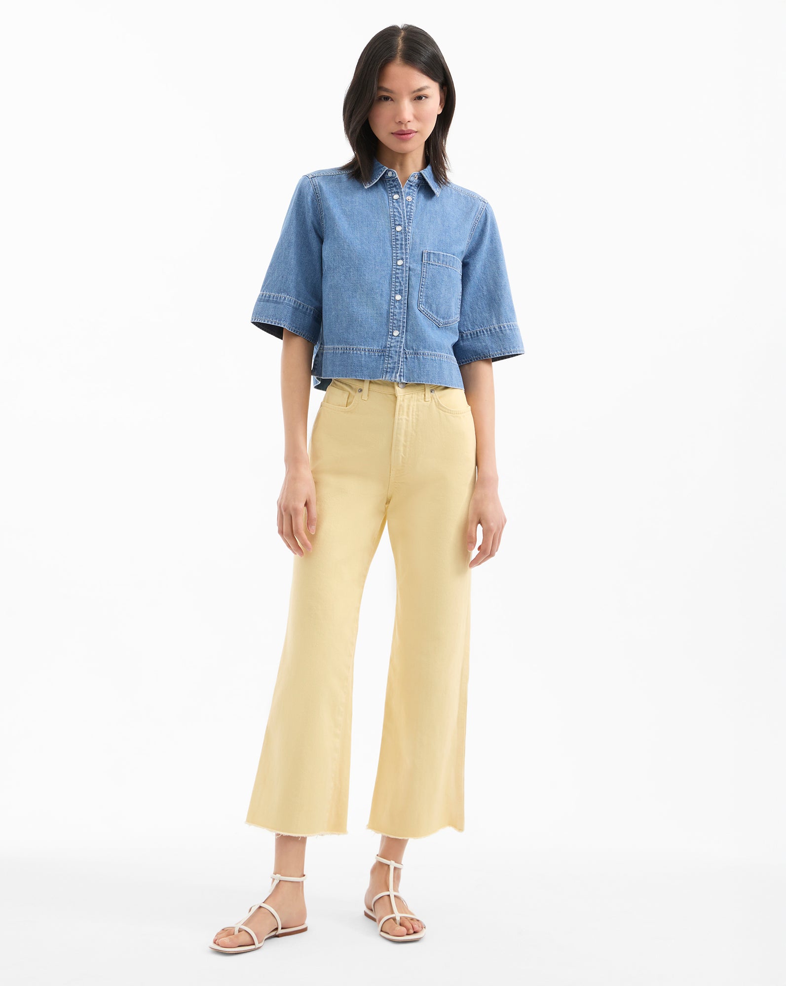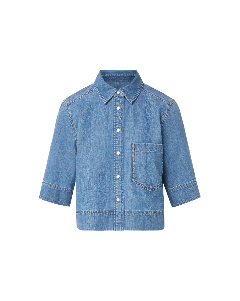 The jean shirt, reimagined. Expertly tailored from lightweight, non-stretch medium wash denim, the Spruce button-down shirt features a cropped, boxy fit with dropped shoulders, and wide half sleeves for an effortless look and feel. A chest pocket and a deep hem complete the look. Pair with wide-leg jeans for a fresh take on double denim.