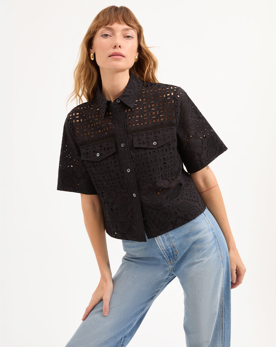 An elevated take on the summer shirt. Expertly tailored from lightweight cotton, the black Spruce top boasts a charming allover eyelet design. A warm-weather wardrobe hero, it's tailored for a cropped, boxy fit with wide half-sleeves for an effortless look and feel. Double front flap pockets add a utilitarian feel. Pair with jeans or the matching Fabian shorts for a dose of casual cool.