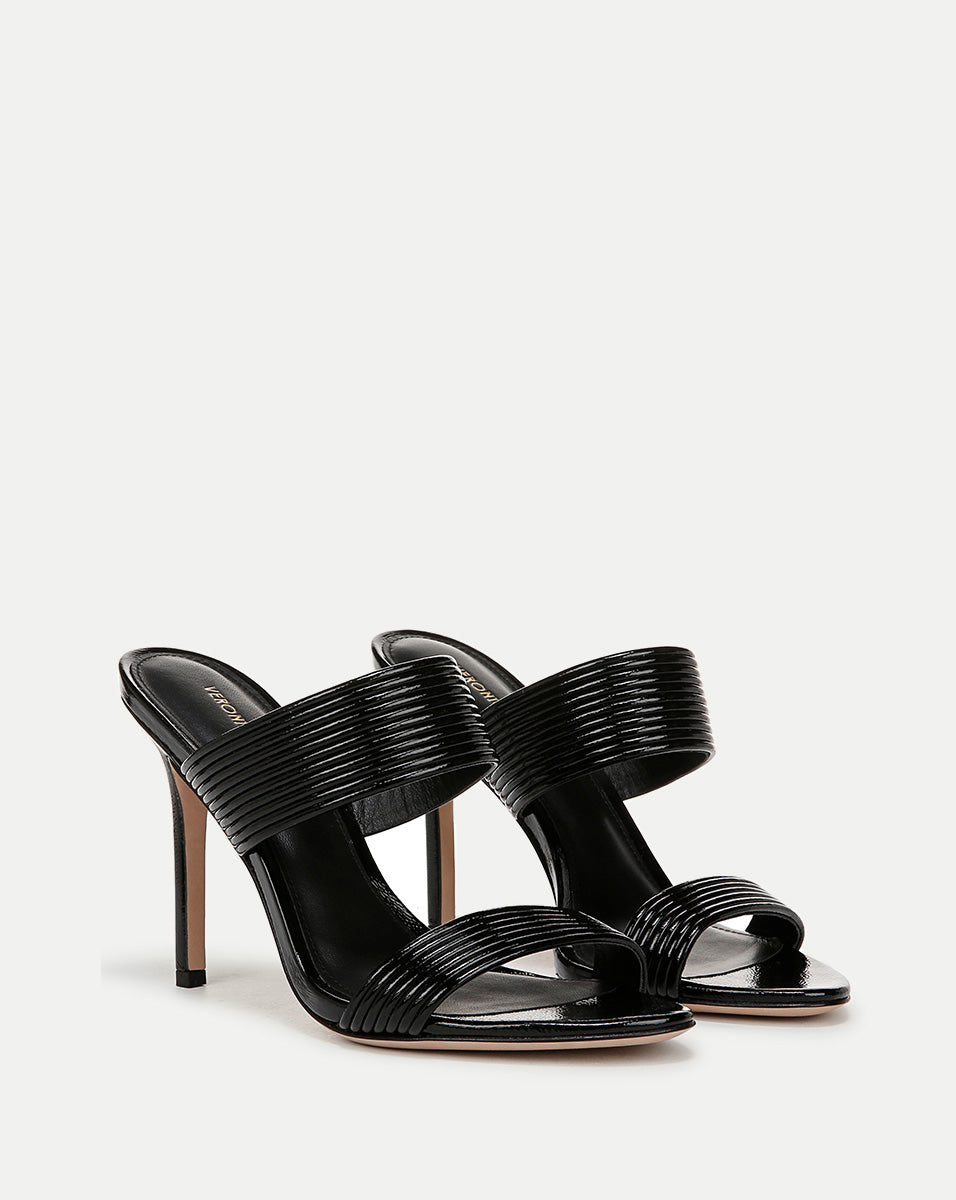 Minimalist and supremely elegant, the Asha sandal is a must-have pair. With textured straps, a nude base and a 4" stiletto heel, this beautifully crafted style is the ultimate in versatility. Wear these black open toe heels it with jeans and cocktail dresses alike.