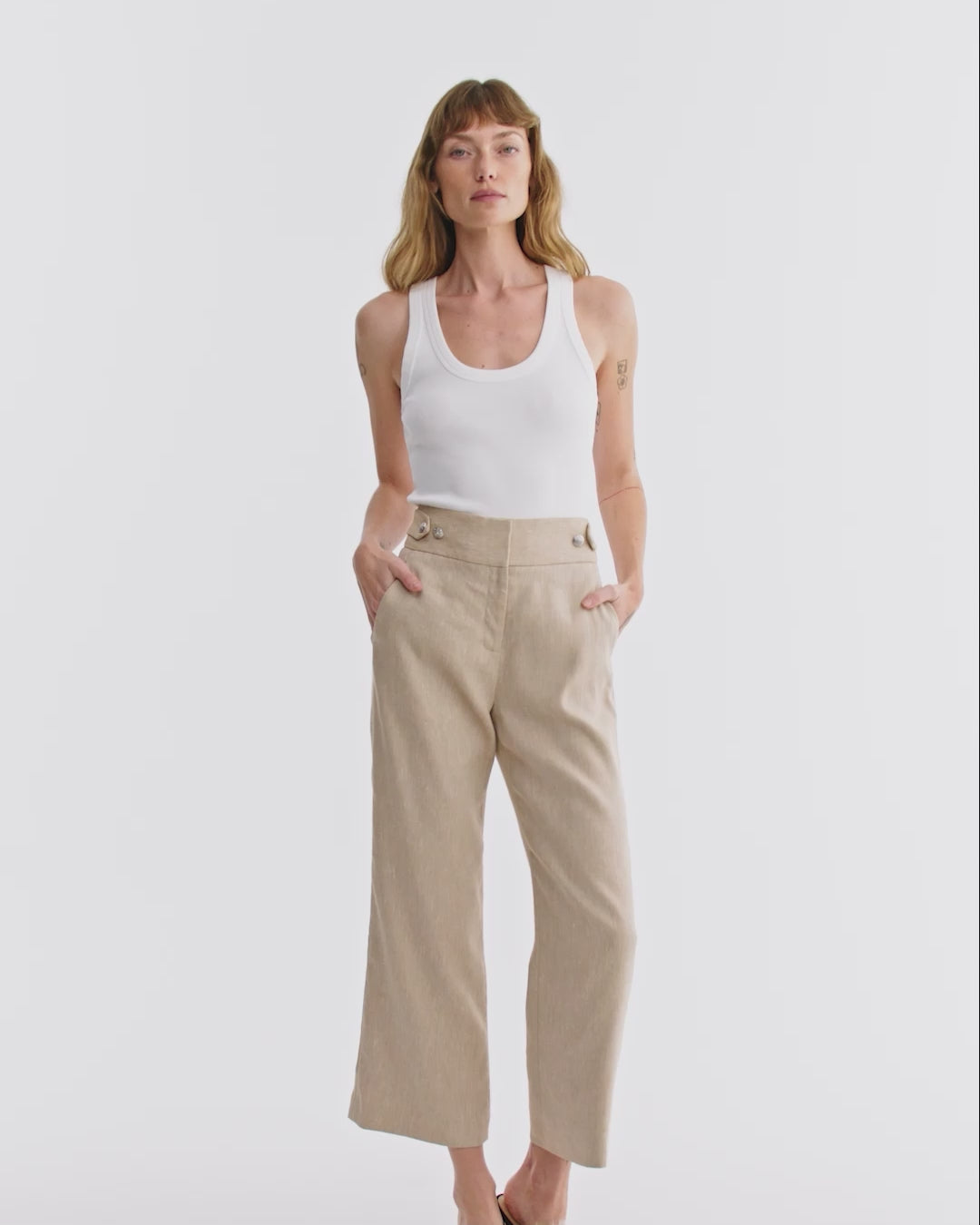 Meet the Renzo’s linen sister—the Aubrie pant. This chic, cropped style is a relaxed take on the best-selling Renzo, with a wider leg and a breathable linen body. Perfect for the office and beyond, these precision-tailored pants are the definition of refined style. Wear with a coordinating jacket for a coordinated look, or tuck in a breezy top for a dinner out.