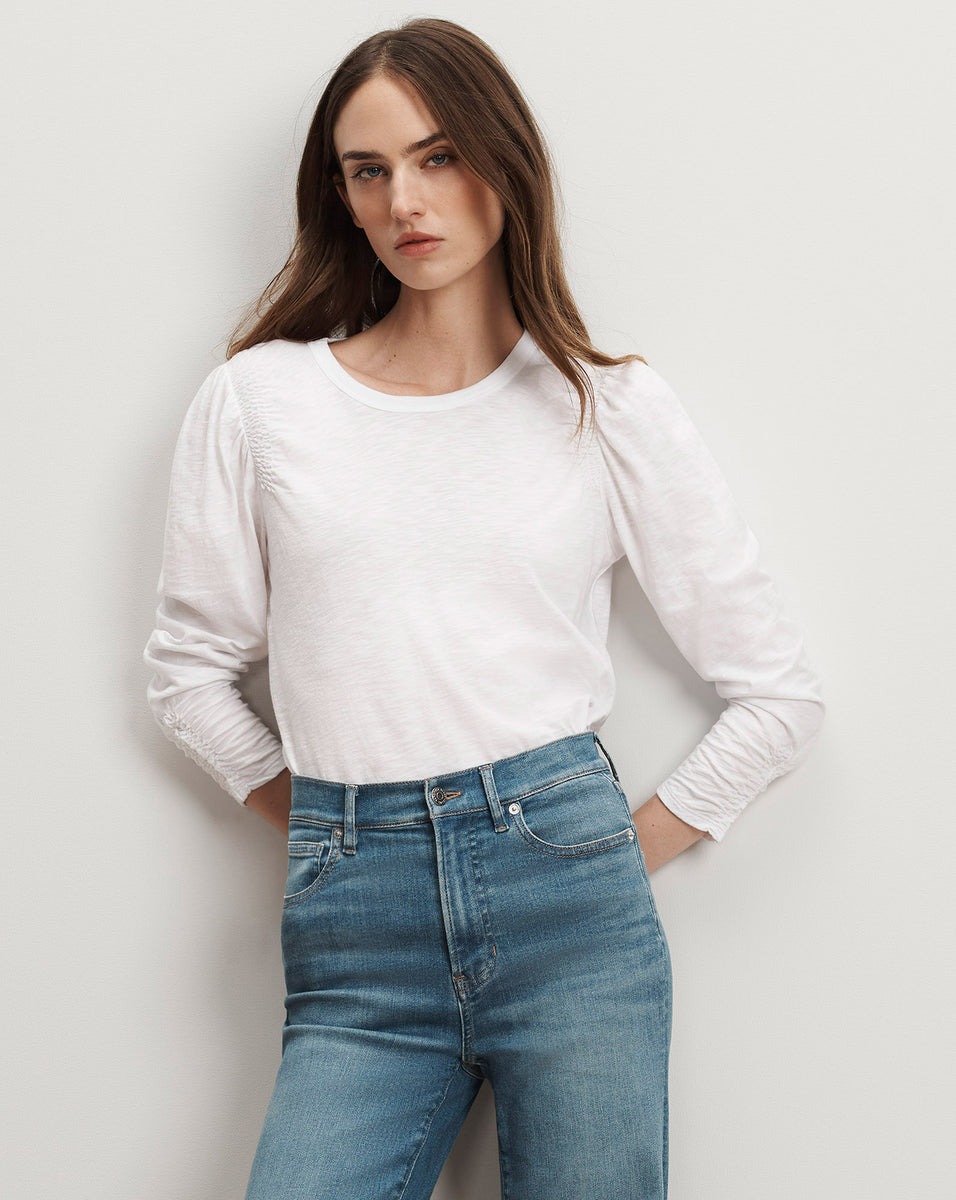 A feminine take on the long-sleeve tee. Crafted from 100% premium cotton in classic white, the Bouvet features smocked ruching along the shoulder seams to create soft folds and subtle dimension. Incredibly versatile, this crewneck pairs effortlessly with jeans, trousers, and skirts alike.