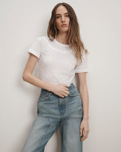 The classic tee, reimagined with thoughtful details. Crafted from soft cotton slub jersey, the Damian features a flattering fitted silhouette with side ruching to define the waist. A mock double crewneck collar and layered short sleeves finish the look, adding subtle dimension. Wear this layered top with your favorite denim for everyday ease, or layer under a blazer for a polished look.