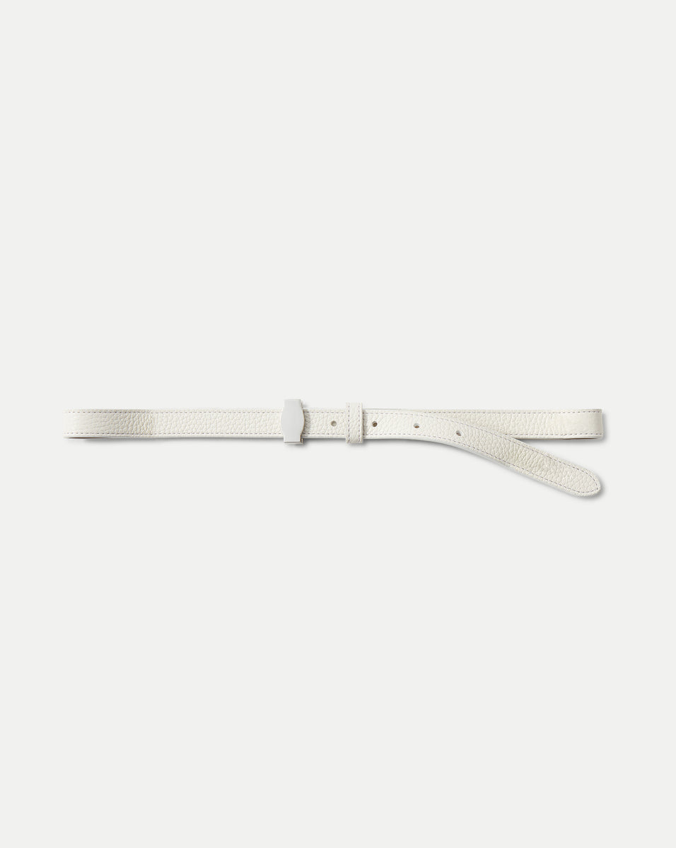 We took the sleek hardware seen on the Veronica Beard Dash bag and reimagined it as a skinny belt. Crafted from tan pebbled leather, the Dash belt features our signature silver collar-stud buckle and a matching keeper to hold the strap in place. Clean and minimalist, this pairs effortlessly with anything and everything. Pro tip: Wear it over a jacket for extra style points.