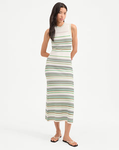 Effortless elegance. The Dawna maxi dress combines a sleek body-skimming silhouette with the comfort and flexibility of our super-stretch, ribbed knit blend. The multicolor stripes in white and greens, meanwhile, add visual intrigue. Consider this sleeveless style the perfect day-to-night, one-and-done wonder—chic with both sandals and elegant stilettos.