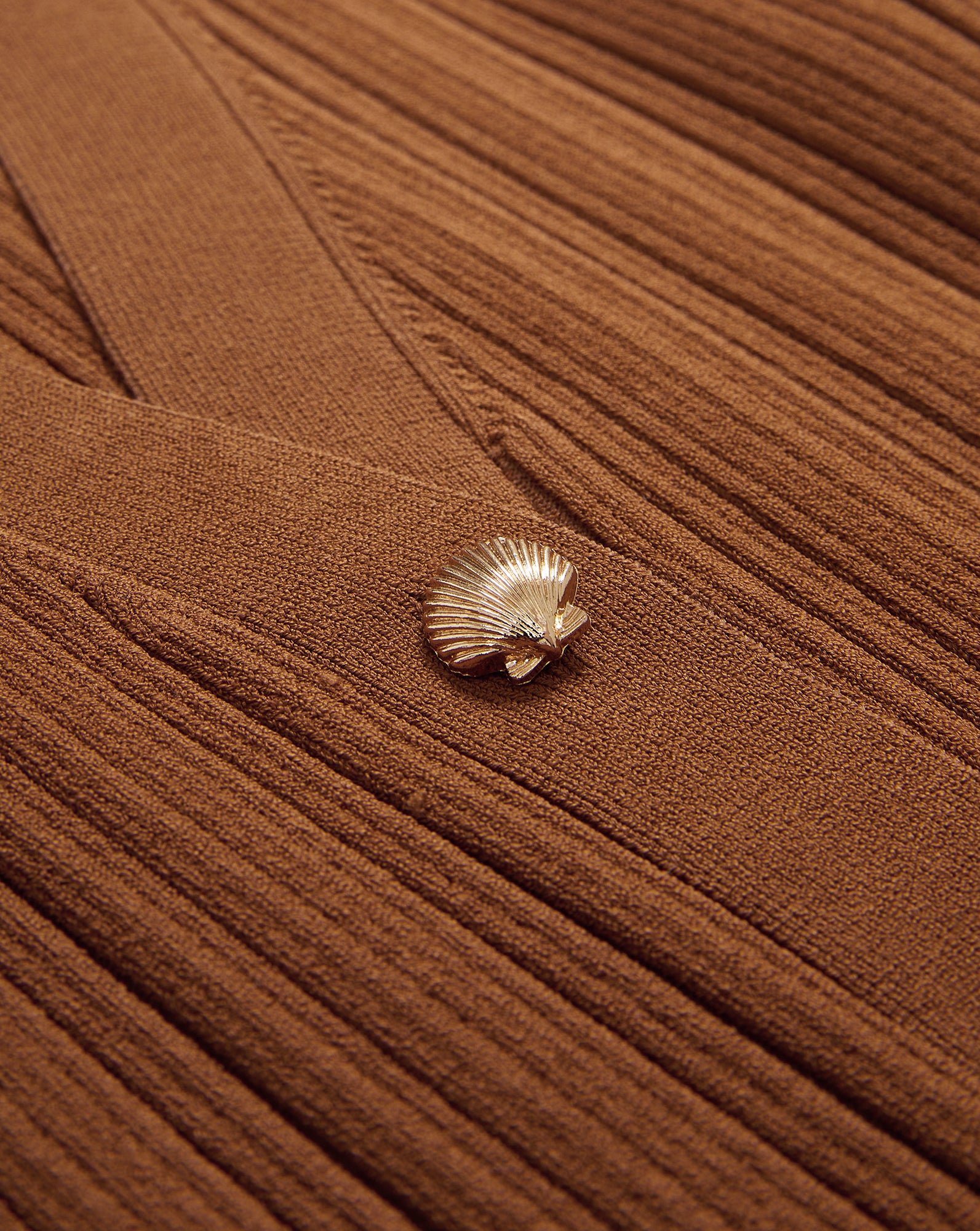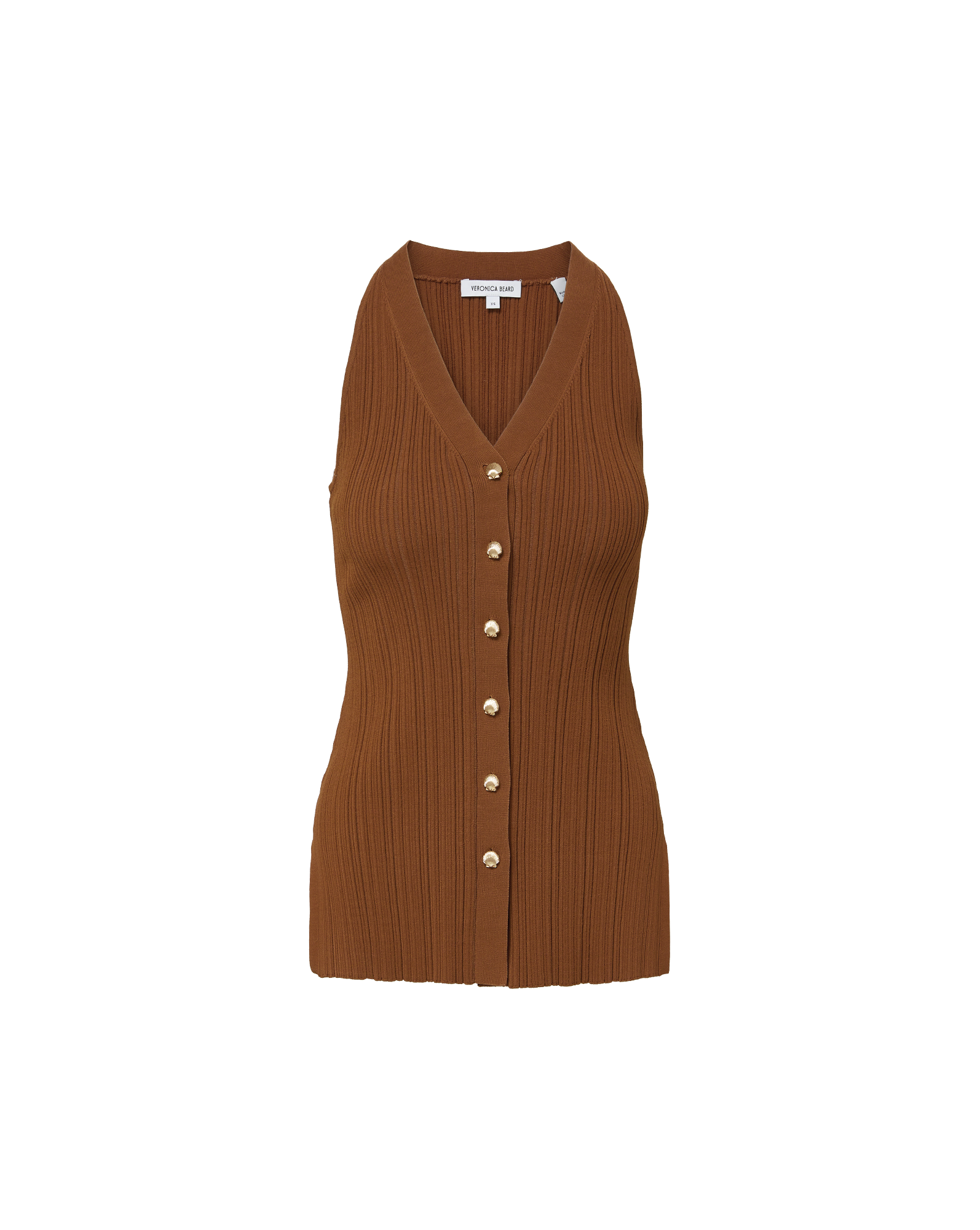 The ease of a knit, the polish of a vest. Expertly spun from a sporty stretch blend, the wrinkle-resistant Dax vest in sepia brown features an elongated silhouette, a slim fit, and textured ribbing to further lengthen the body. Charming shell-shaped gold buttons complete the look. Pair with the coordinating Massaro pant for an effortless set that’s both high impact and high comfort.