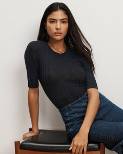 A seasonless base layer you’ll reach for year-round. Expertly spun from pure Italian merino wool in navy, the Debois top is knit with wide ribbing for subtle dimension and a body-hugging fit. Designed with a classic scoop neck and half sleeves, it’s soft, breathable, and easy to layer— style with a blazer and denim for a classic VB look.