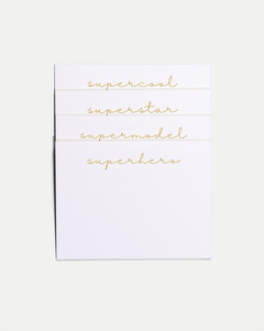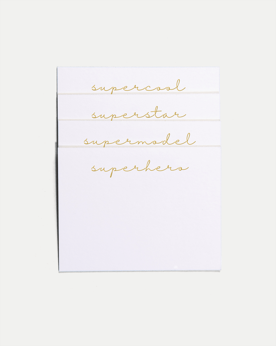 A playful addition to your tablescape. Crafted from smooth, heavyweight paper, these place cards add both charm and intention to your next dinner party. Each set includes four witty options—Supercool, Superstar, Supermodel, or Superhero—engraved in gold ink and finished with a gold-painted edge. They’re the perfect way to seat your guests and set the tone for the evening.