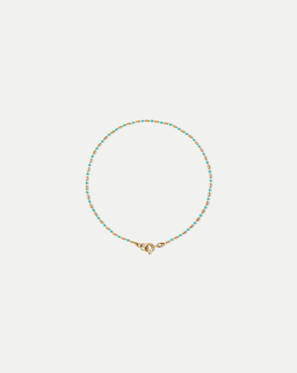 The everyday anklet, ready for wherever your summer may take you. This dainty chain features a mix of gold-toned and turquoise enamel-covered beads, featuring IP plating for added durability and water resistance and securing with a Q clasp for ease. Wear it solo or layer with other colors—it’s perfect for the beach, the pool, and beyond.