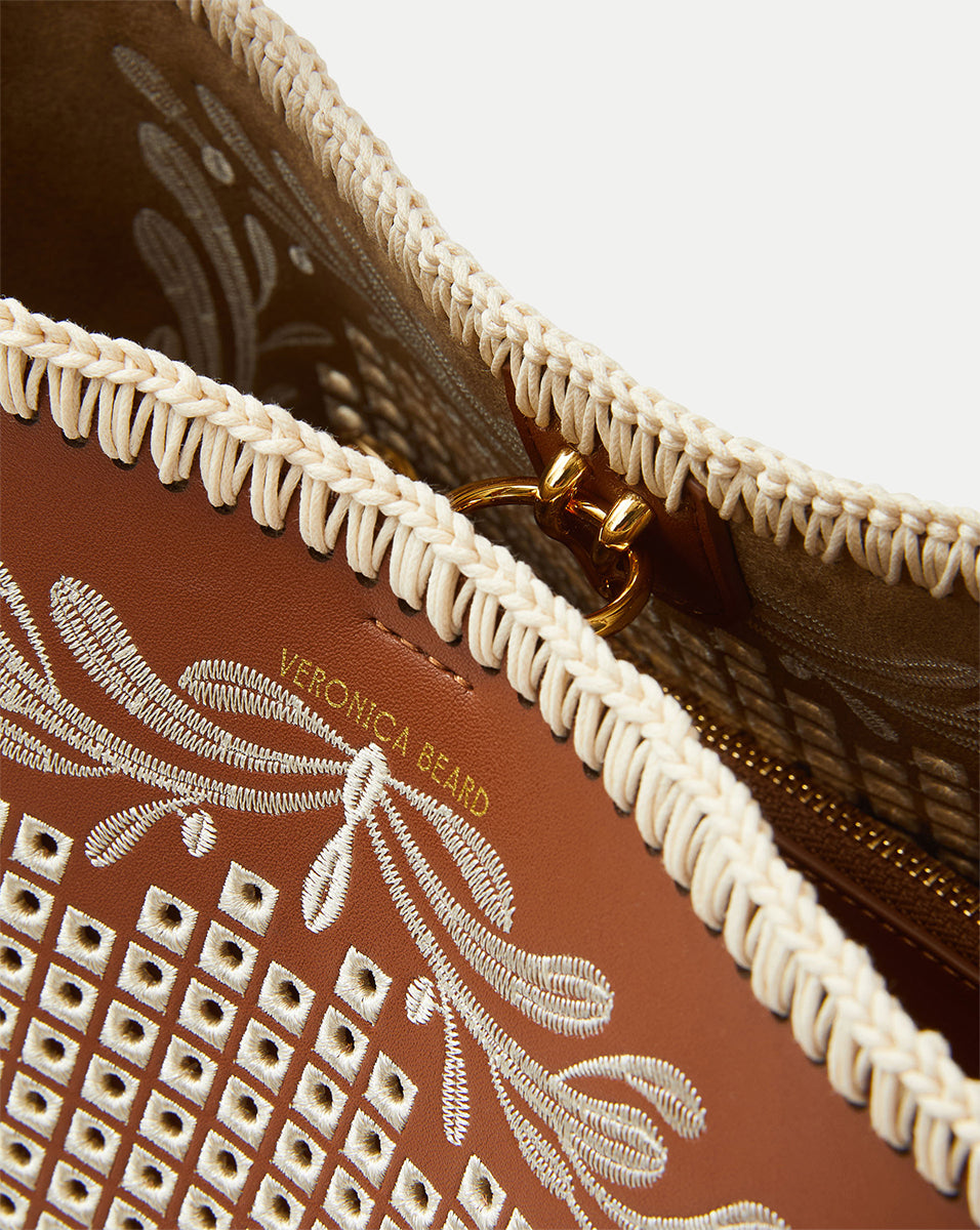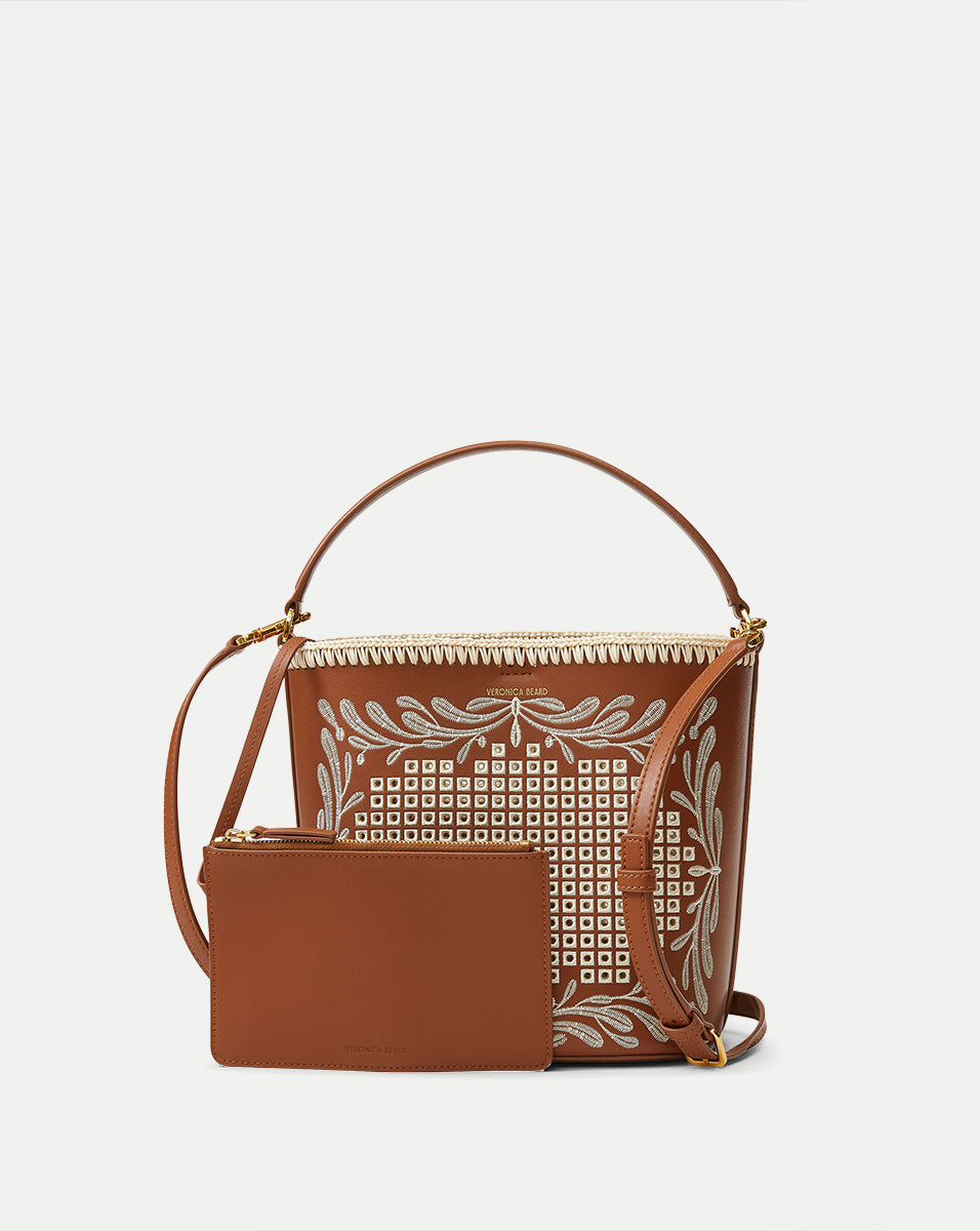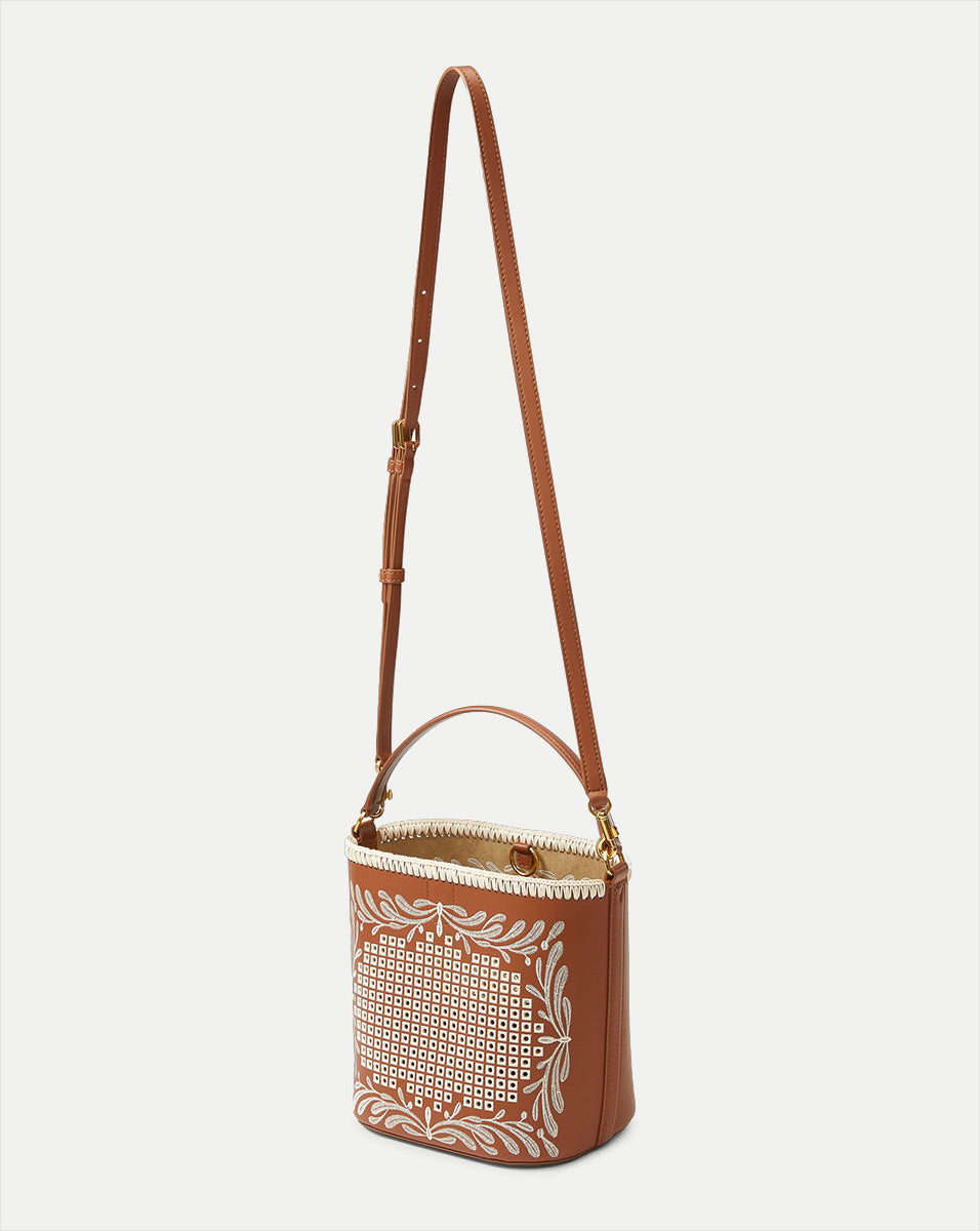 The chic and streamlined Feedbag you know and love, now crafted in polished fine-grained tan leather with cotton wax cord eyelets, embroidery, and whipstitched edge. This compact style is finished with both a structured top handle and a removable shoulder strap for maximum versatility. This embroidered bucket bag features an interior zip pouch and V-shaped hook-and-eye closure ensure convenience and ease.