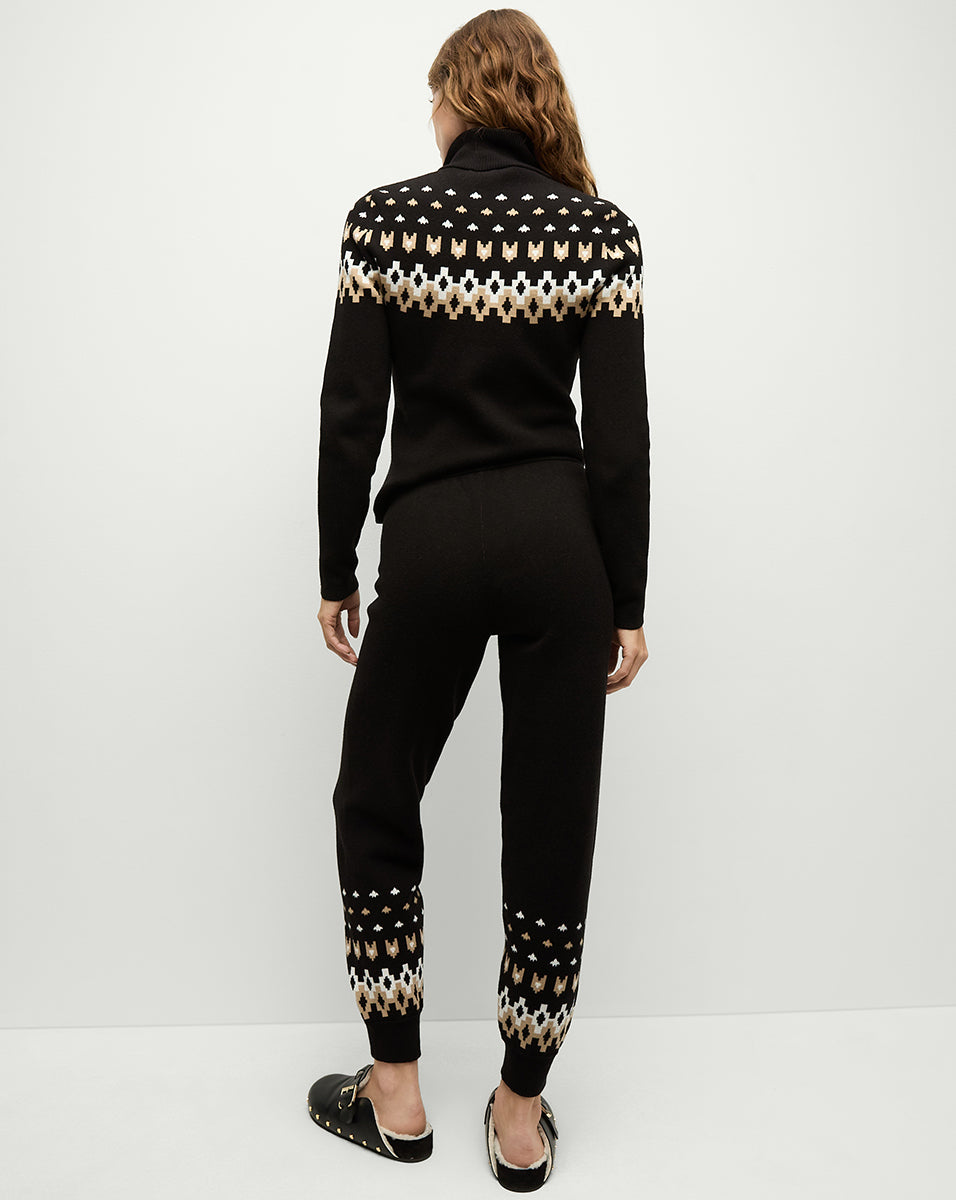 Après-ski, with a VB twist. Spun from organic cotton with stretch for ease, the Fairbanks Blanche knit turtleneck is a luxurious layering piece. The half-zip design ensures ease of wear while the Icelandic-inspired patterns add an alpine-chic touch. Pair with the matching Fairbanks joggers for a sportif set—or with jeans and booties for everyday.