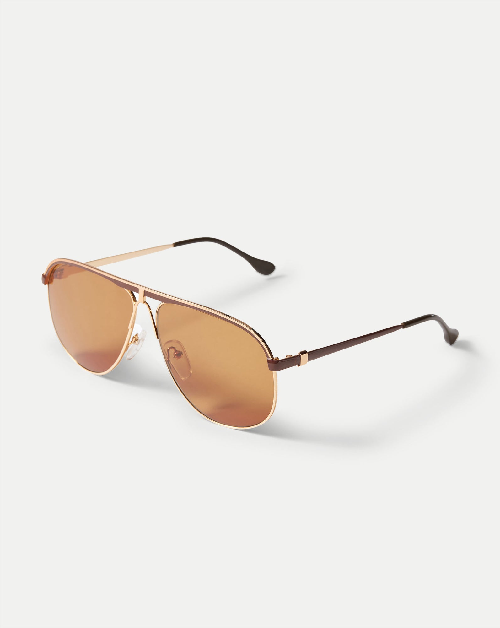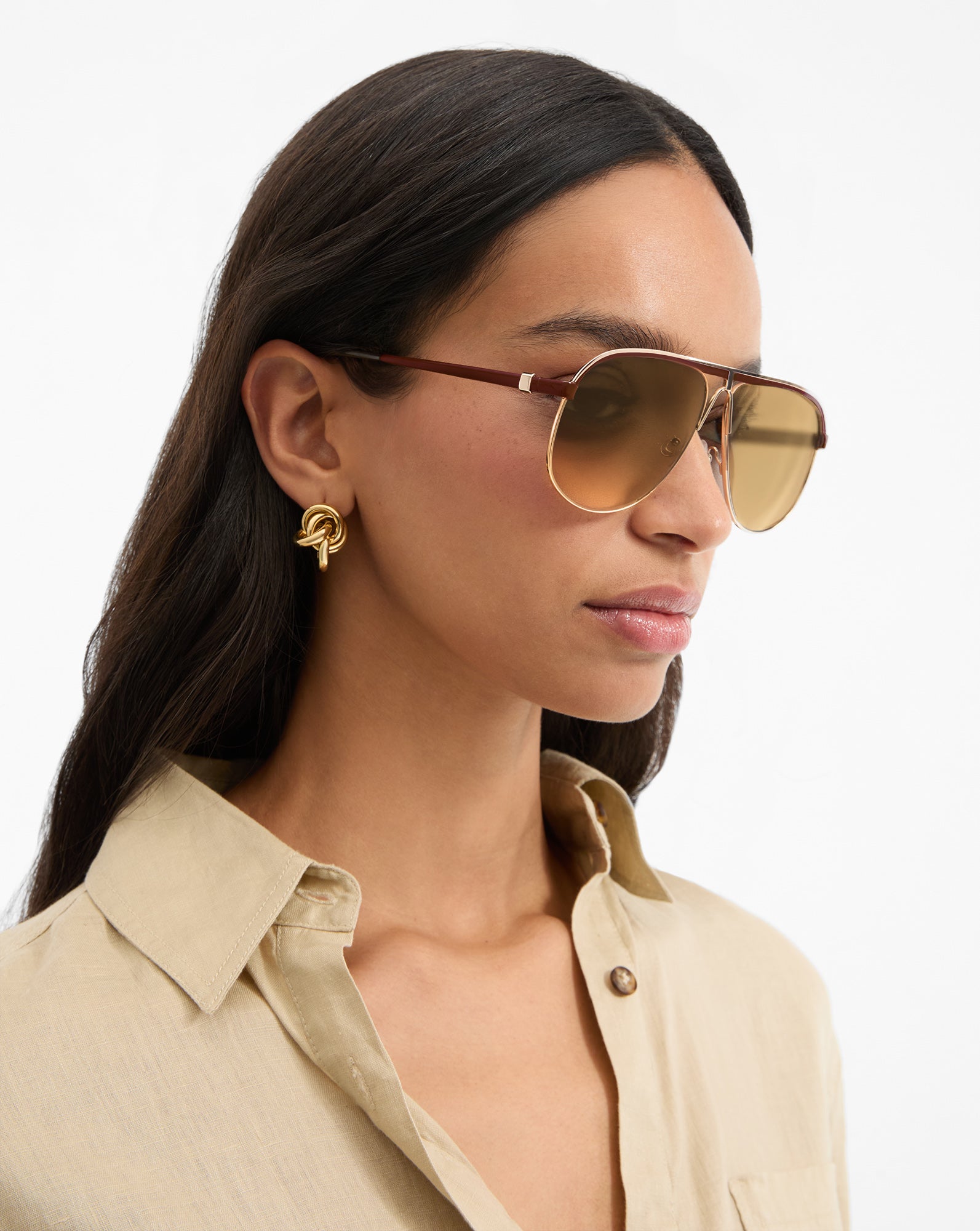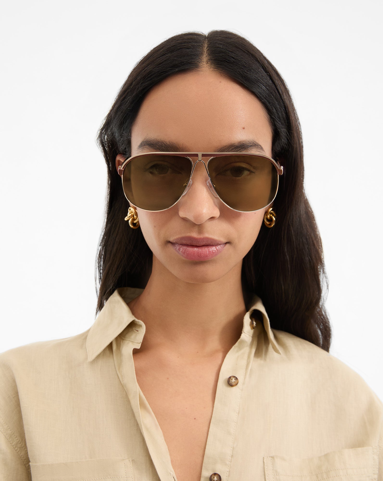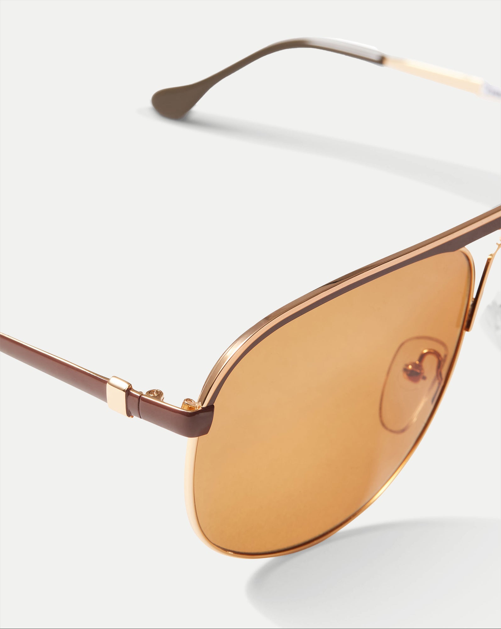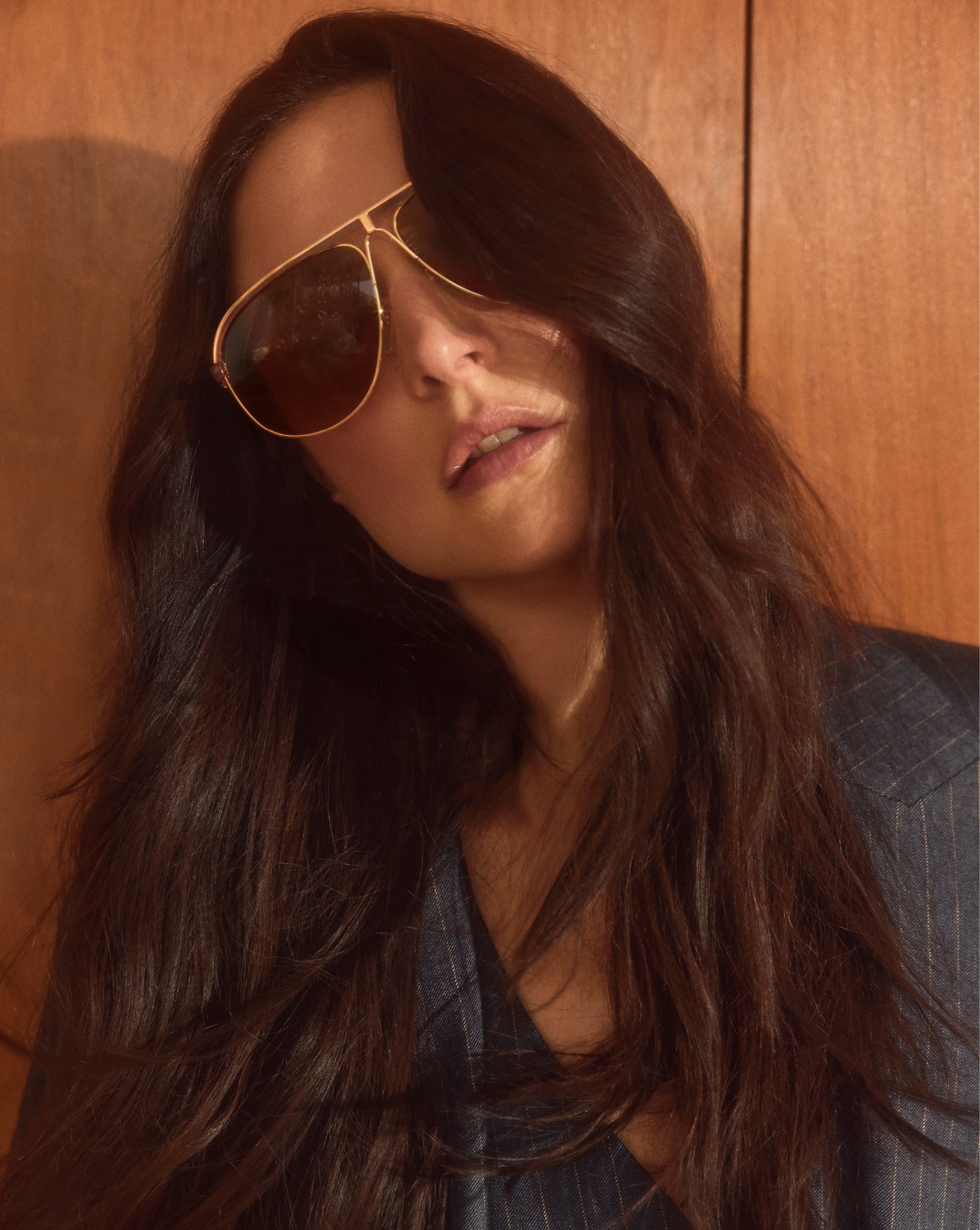A luxe take on the classic aviator, the Farrah captures the effortless cool of its iconic ‘70s namesake. Produced by the renowned Selima Optique, it features a slightly oversized silhouette crafted from sturdy metal Monel, accented with gold-toned stainless steel wire rims and brown enamel along the temples and brow line. Durable brown-tinted CR-39 lenses, Monel hinges, and a gold-engraved Veronica Beard logo at the temple interior complete the look. Sleek and effortless, these aviator sunglasses are a perfect choice for sun-soaked days—whether you’re on the beach or city streets.
