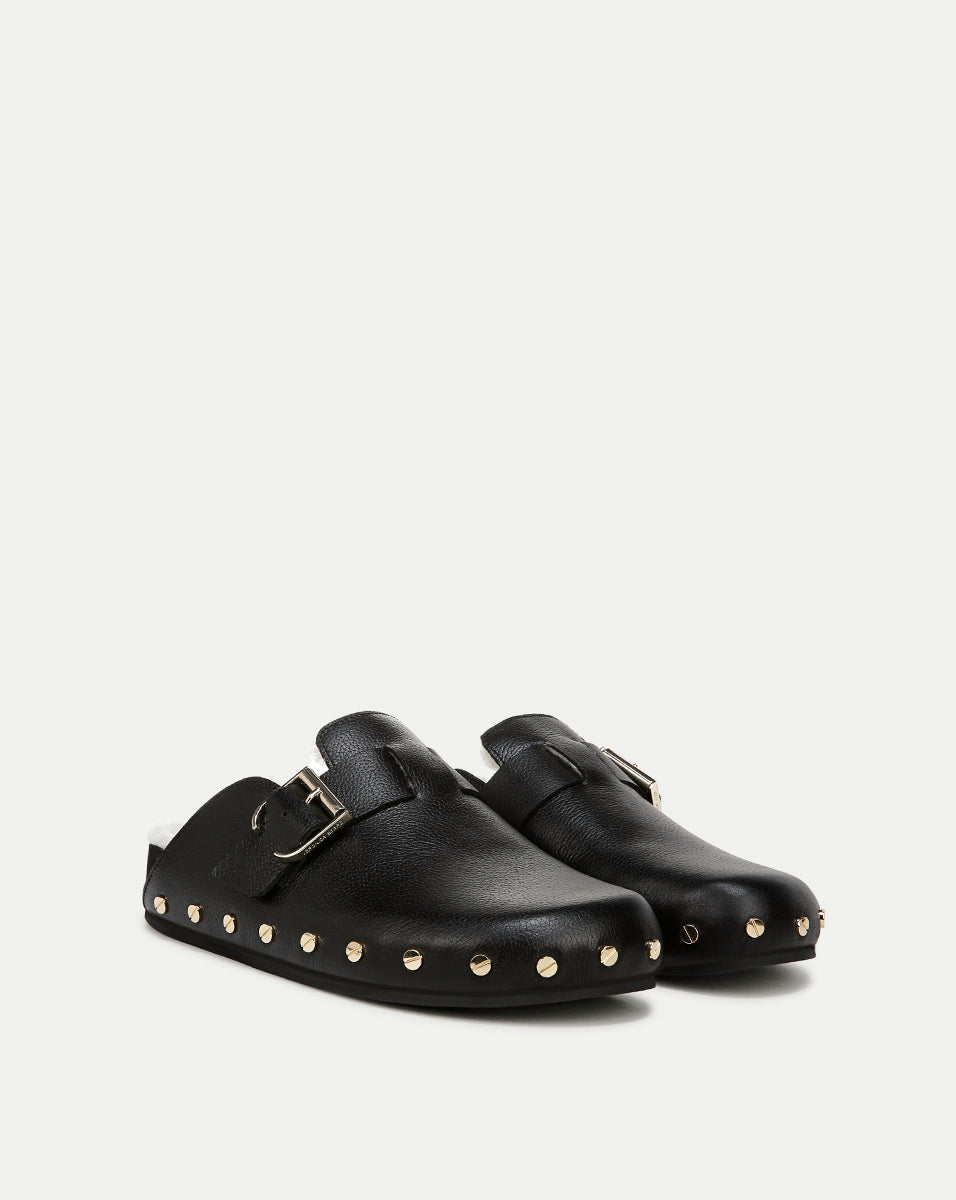 A chic clog, with the slide-on ease of a mule. The Fern features a leather exterior, a plush shearling interior, an adjustable buckle and studs along the base. Pair these studded clogs with everything from cropped denim and tees to skinny-leg trousers and relaxed knits.