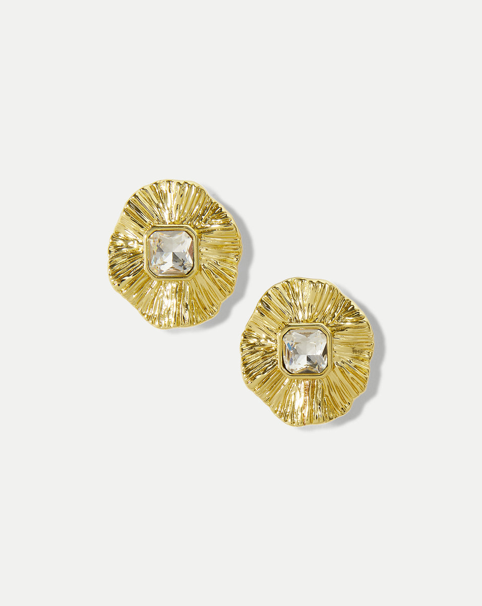 The statement earring, perfected. This bold sculptural flower earring is crafted from 12k gold-plated brass and finished with a radiant-cut glass stone at the center. A timeless addition to any collection, it looks just as good with a sweater as it does for special-occasion dressing.