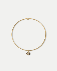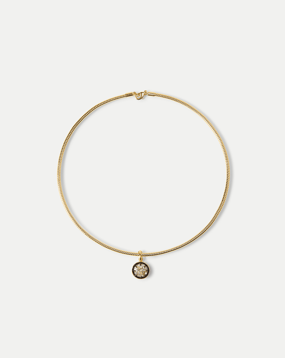Equal parts polished and cool. Falling just below the collarbone, this snake chain necklace is crafted from 14-karat gold-plated brass and features a round crystal pendant set in a contrasting black enamel multi-prong frame. A secure barrel clasp ensures easy wear. A versatile favorite, it transitions seamlessly from daytime dressing to night-out looks.