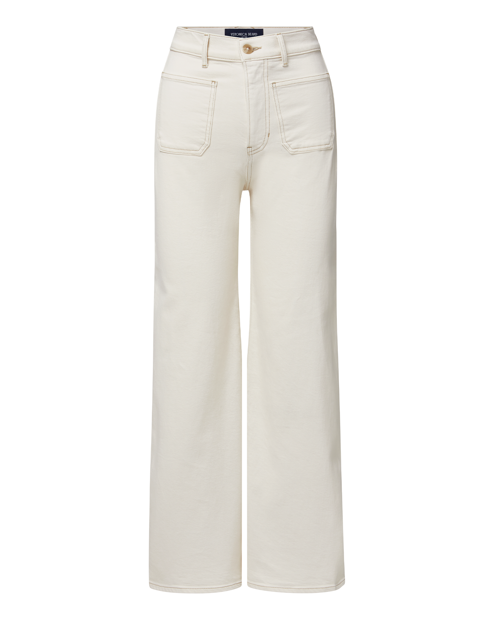Meet the Grant, our classic high-rise, wide-leg silhouette with an ankle crop. Made in LA from comfort-stretch Japanese white denim it has the most flattering fit and a quick recovery. Finished with patch pockets and a horn button, it's easily dressed up or down. In summer-ready ecru, this pairs well with blazers and sandals for our tried-and-true VB uniform.