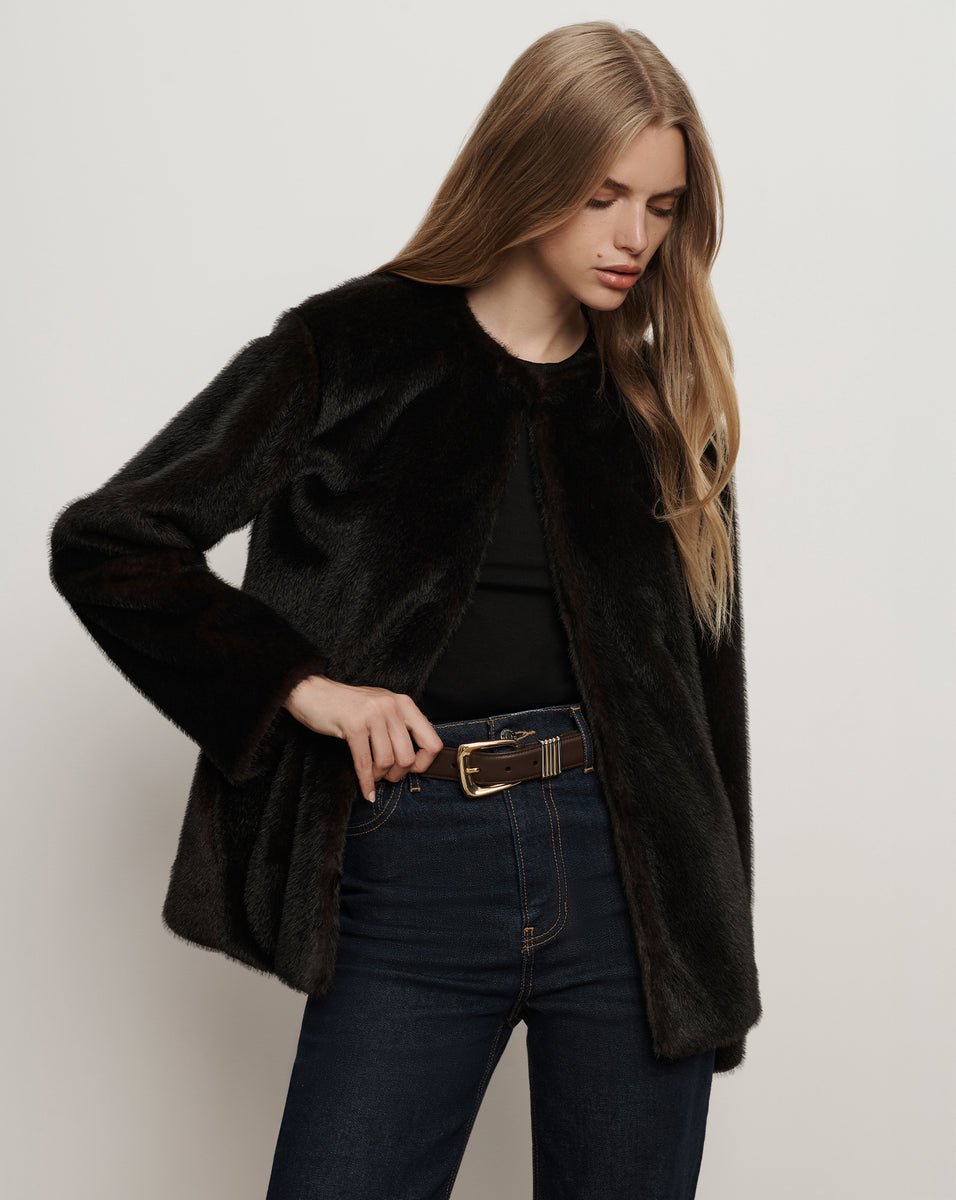 An elegant top layer to elevate any cold-weather look. Crafted from luxurious faux fur in rich brown, the Griselda features a boxy, collarless silhouette with dropped shoulders and a cropped hem, for a more relaxed and modern feel. Finished with a hidden hook-and-eye closure for a clean, streamlined effect, it's a chic layer you'll reach for all season long.