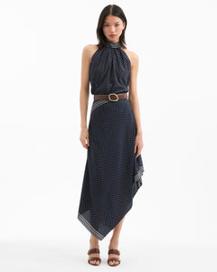 Expertly made from premium stretch silk, the Hartley skirt is defined by a high-low asymmetrical hemline and a beautiful drape. Equal parts demure and polished, it features a decorative trim of trompe l'oeil chain-links against navy and white polka dots. Wear this asymmetric polka dot skirt with a silk button-down for work and with the matching Kovi halter top for nights out.