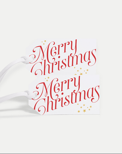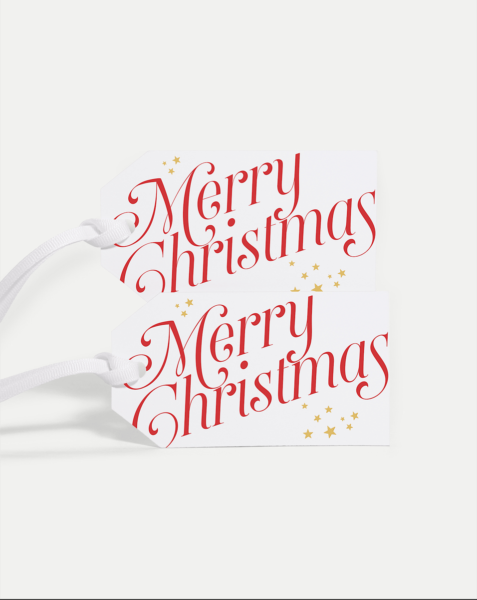 Make every gift feel more personal. Crafted from smooth white paper and tied with a matching ribbon, these Merry Christmas gift tags feature elegant red script and gold star accents. Just sign your name and you’re set.