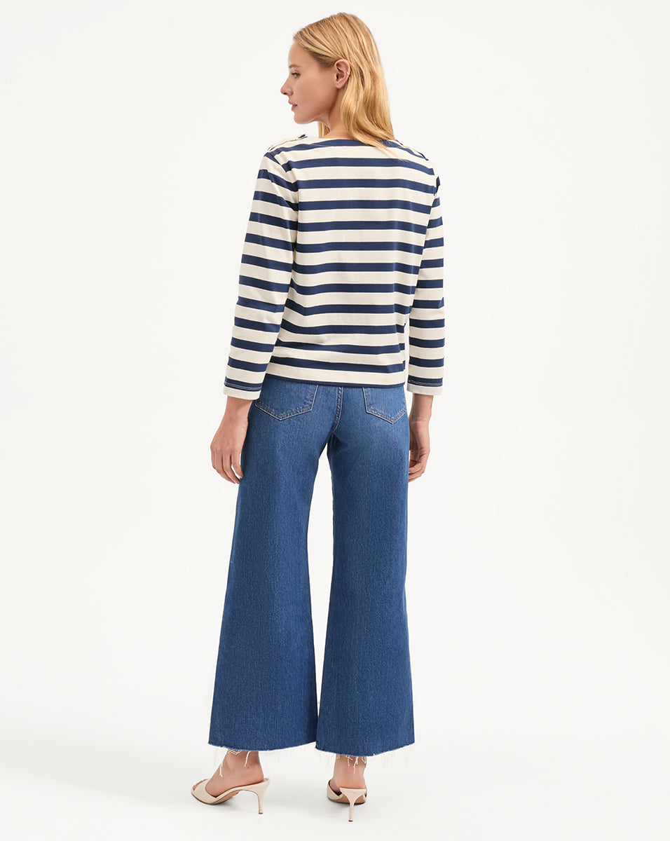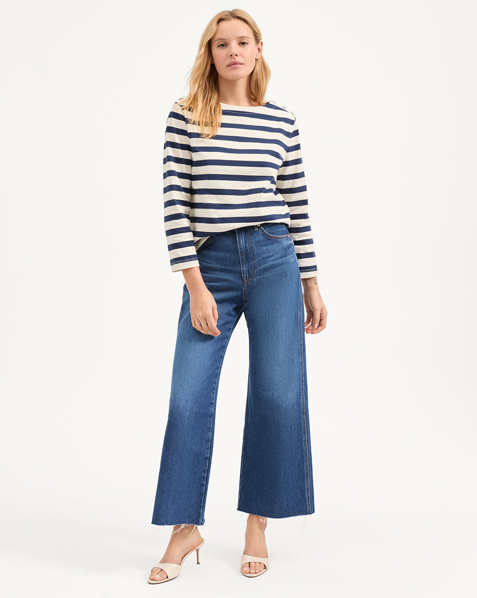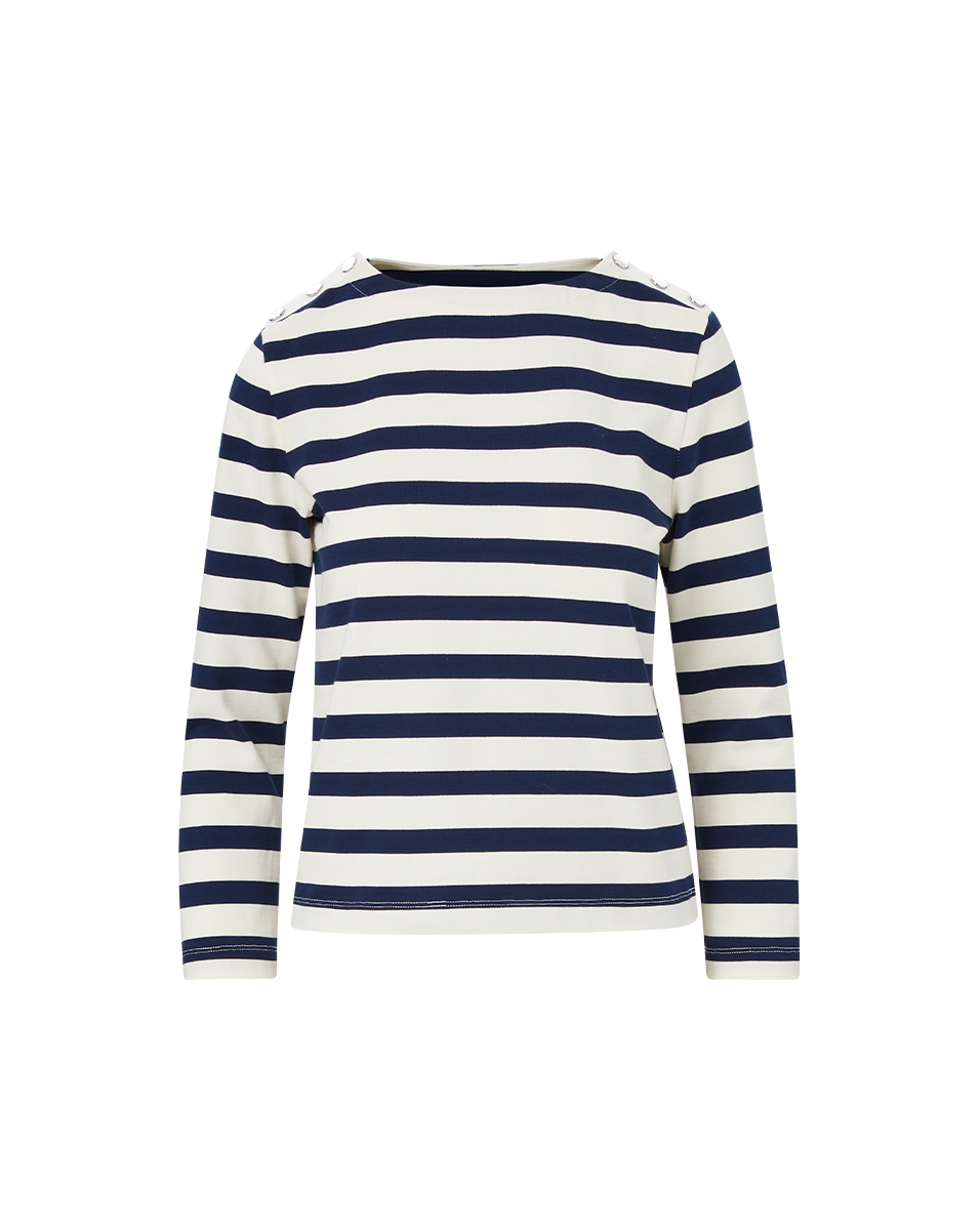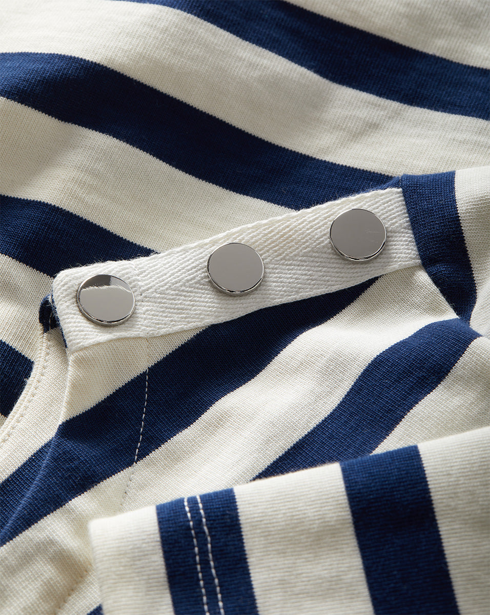 A year-round closet essential. Cut from 100% heavyweight cotton, the Hovey long-sleeve tee boasts a boxy, relaxed fit, finished with bold mariner navy and white stripes, a boatneck neckline and decorative snaps at the shoulders. It’s a foolproof pairing with your favorite jeans.