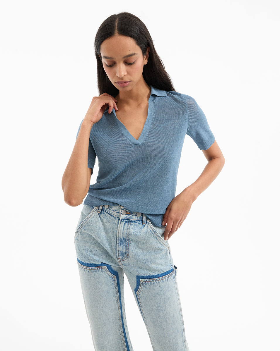 Spun from soft stretch linen, the Issa top is a refined twist on the classic polo shirt. In light blue, it's defined by a relaxed fit, flattering half sleeves, a ribbed trim, and a collared V-neck. The ultimate in versatility, this pairs well with anything and everything—jeans, shorts, maxi skirts, minis, you name it.