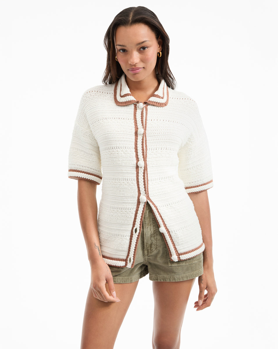 A lightweight layer with endless versatility. Spun from 100% cotton, the Jadine sweater is an elongated white cardigan with a contrast-color trim in versatile sepia. Thoughtfully designed for comfort and ease, it features dropped shoulders, half sleeves, plus a knitted collar and buttons. A wear-forever staple, it's cozy yet lightweight—perfect for chilly offices and breezy summer nights.