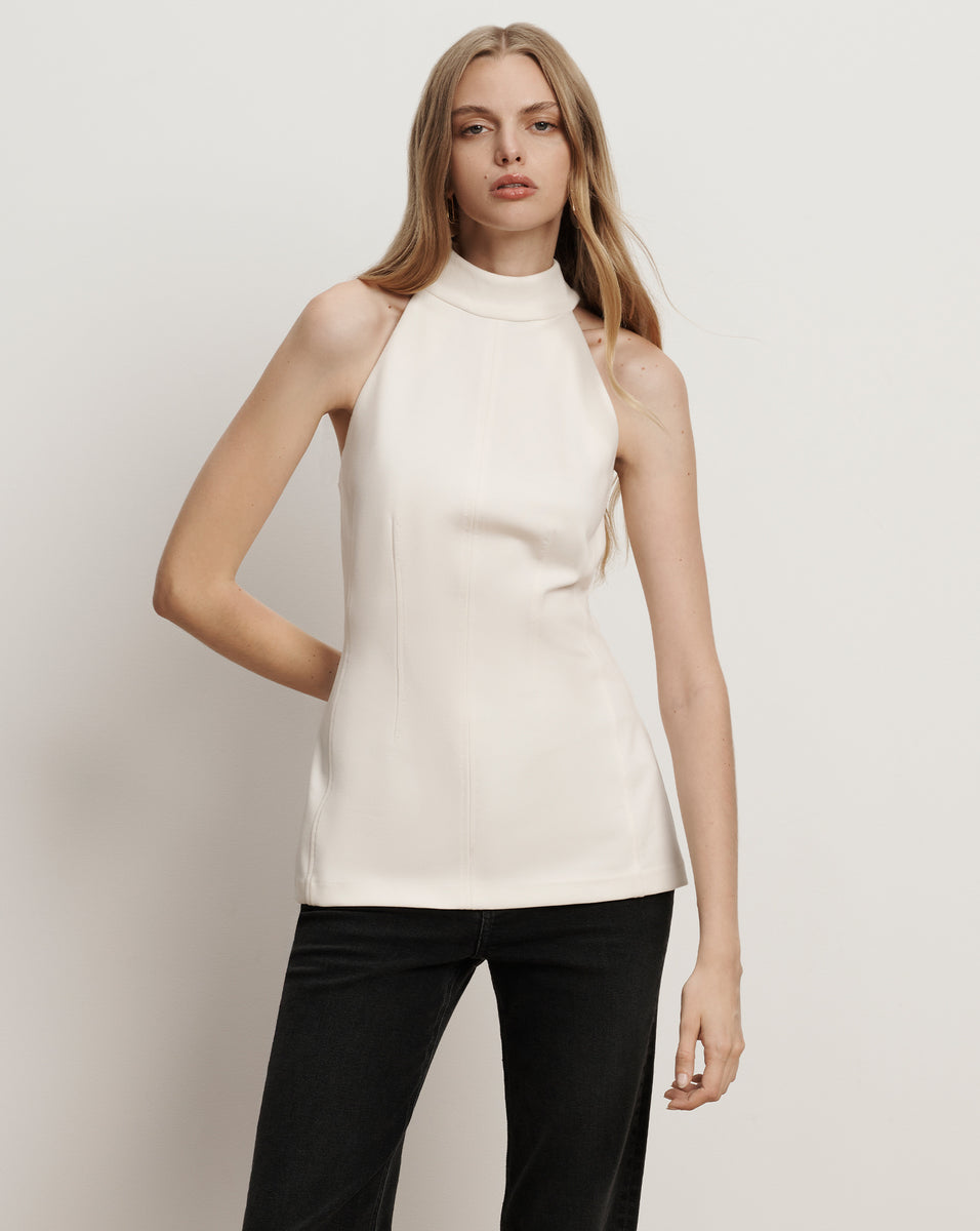 Sleek and sophisticated. Crafted from a premium stretch blend in white, the Johanne top features a halter neckline with waist and back darting for a flattering fit, finished with a back zip closure. Pair it this sleeveless top with the coordinating pants for a chic set, or layer over a maxi skirt for evening.