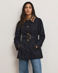 Crafted from a cotton-blend with a durable wax finish, the Langham is your go-to coat for every day. In deep navy, this elevated trench features a removable bead- and crystal-embellished collar for versatile styling, faux horn buttons down the front, and a wide, faux-horn-buckle belt to define the waist. Contrasting brown cuffs and collar add a refined touch, while dickey compatibility offers even more styling options.