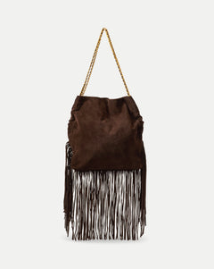 Crafted from premium Italian suede in dark brown, the aptly named Slouch is defined by its soft silhouette and subtle gathering at the sides. Now updated with dramatic fringe, it brings a bohemian edge to a classic shape. The spacious interior includes generous pockets and a zip compartment, while the gold chain-link strap—interlaced with black leather—adds a glamorous edge. A cool classic for years to come.
