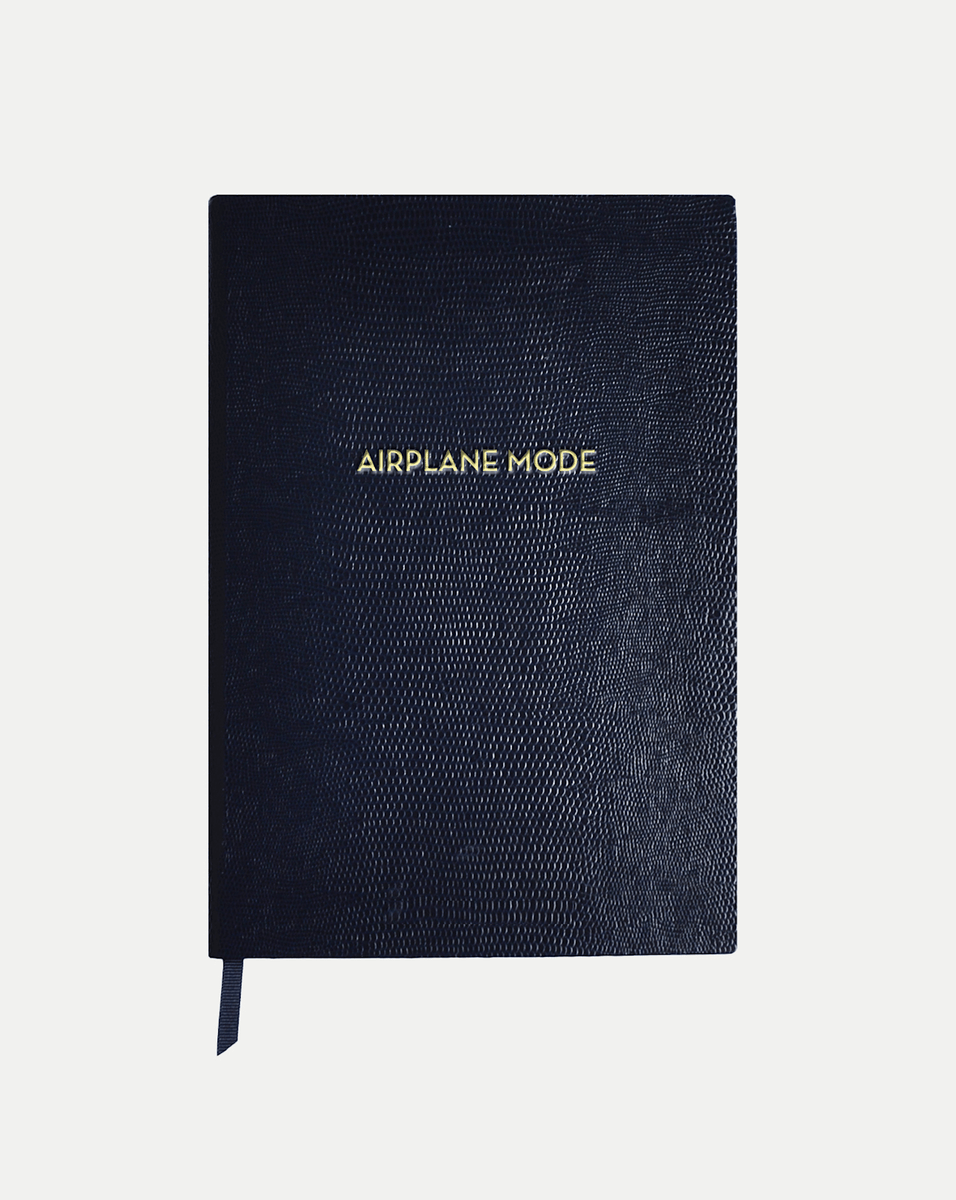A luxe notebook for capturing your best ideas, dreams, and goals. Handmade in England by classically trained bookbinders, it's crafted from navy lizard-embossed card with gold-embossed text reading Airplane Mode on the front cover. It’s finished with a navy grosgrain ribbon page marker to keep your spot—ready for when inspiration strikes next.