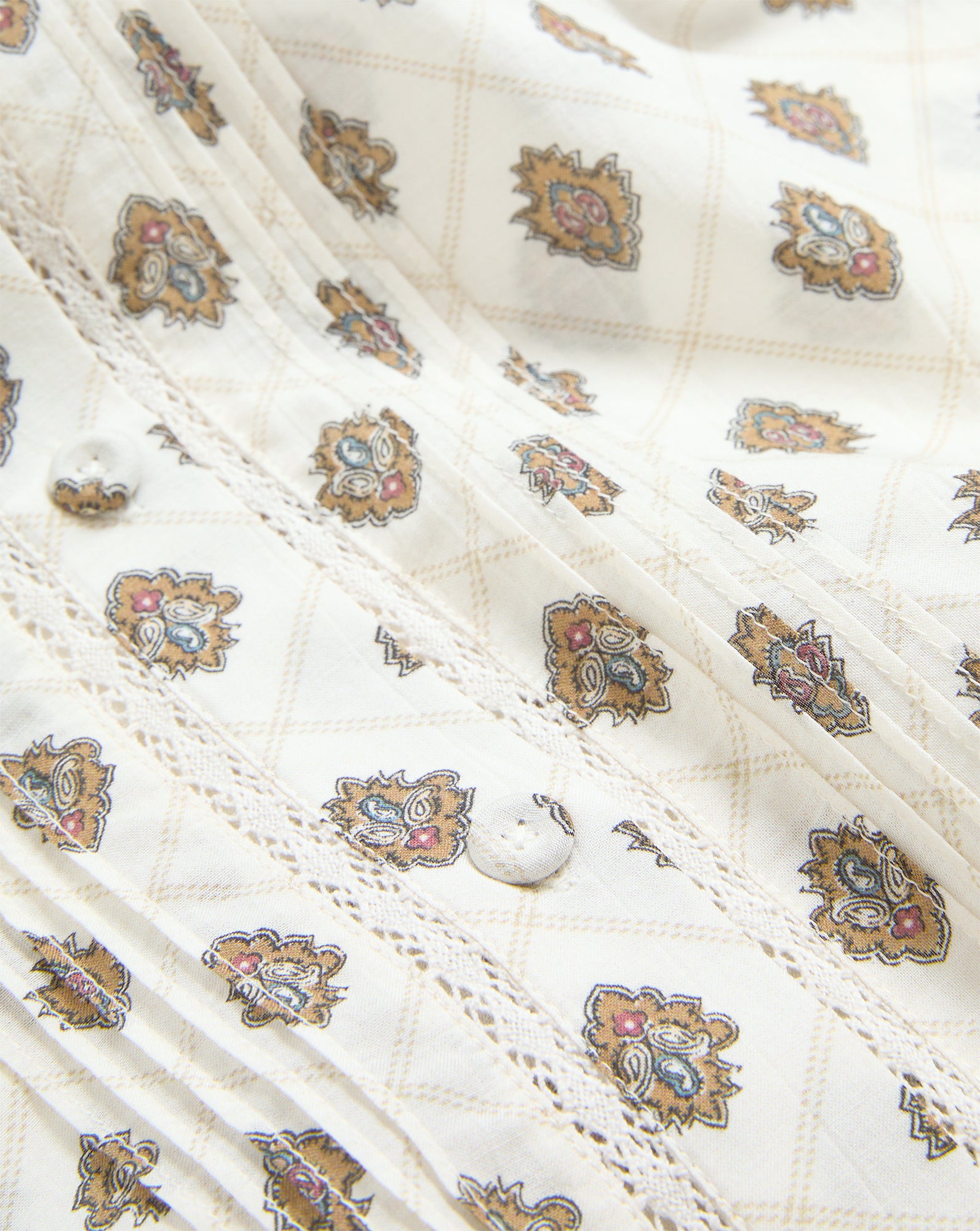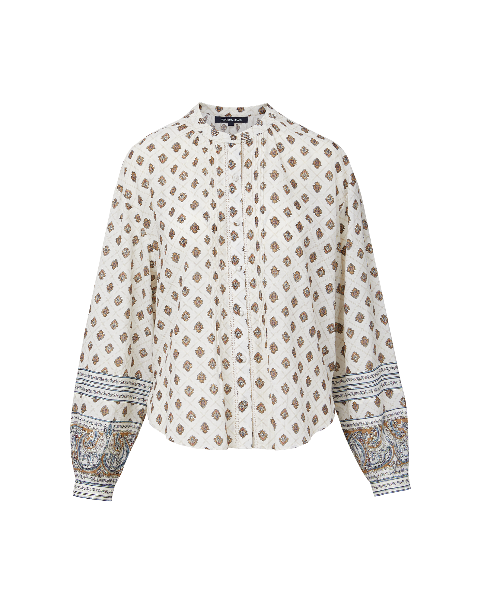 Bohemian ease. Crafted from premium stretch cotton, the Lollie button-down off-white blouse features a relaxed silhouette, dropped shoulders, and generous blouson sleeves. An engineered print, meanwhile, mixes an allover tile pattern with a band of pretty paisleys by the cuffs. Pair with jeans, shorts, and miniskirts—it's perfect for weekends and wanderlust.